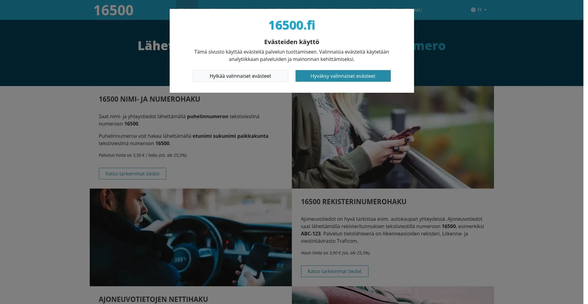 Yhteystiedot, numerot ja ajoneuvon tiedot helposti tekstiviestillä. Lähetä nimi, puhelinnumero tai rekisterinumero tekstiviestinä numeroon 16500.