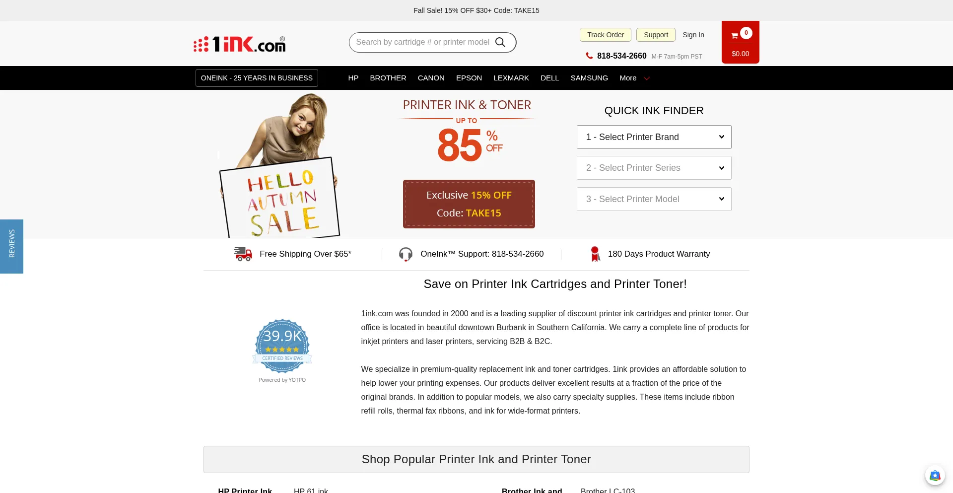 Shop discount printer ink cartridges and printer toner. 100% Satisfaction Guarantee. Over 20 years in business. Get 15% OFF entire order with code "INK15"