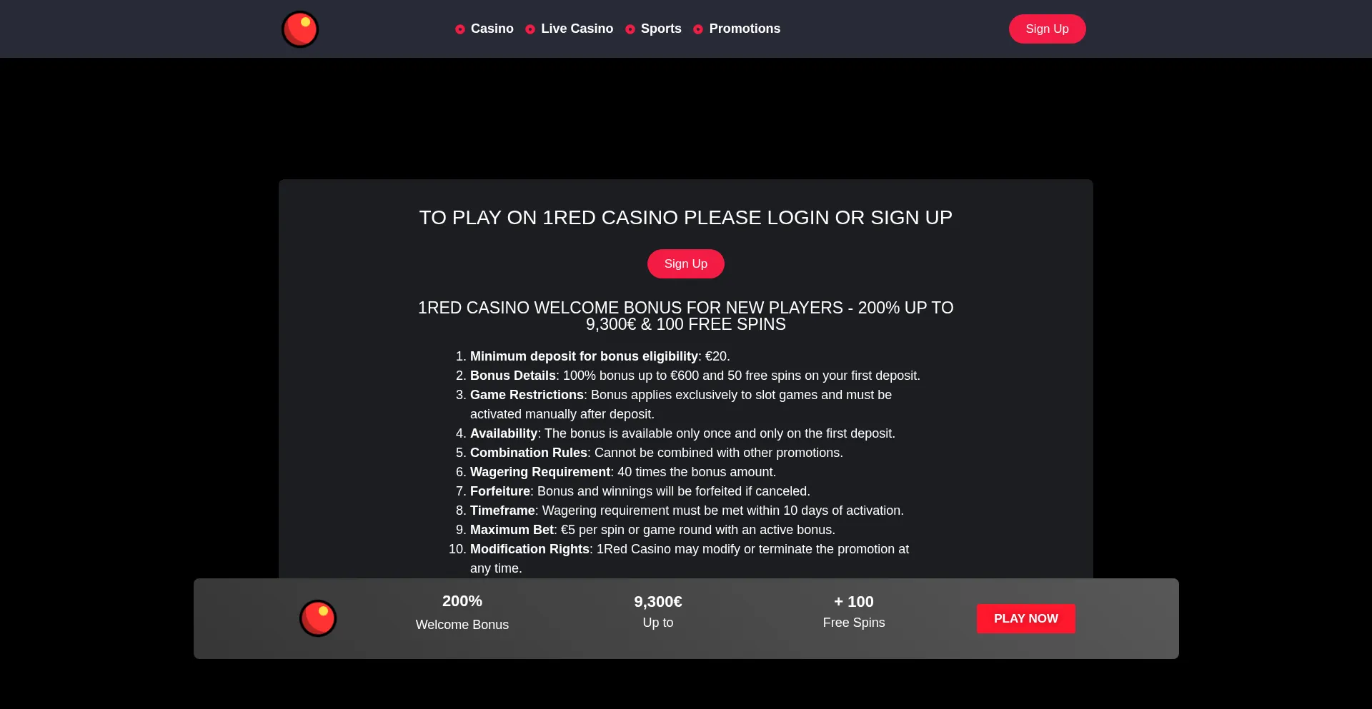 Sign up at 1Red Casino to unlock exclusive bonuses and promotions. Enjoy 200% up to €9,300 + 100 Free Spins