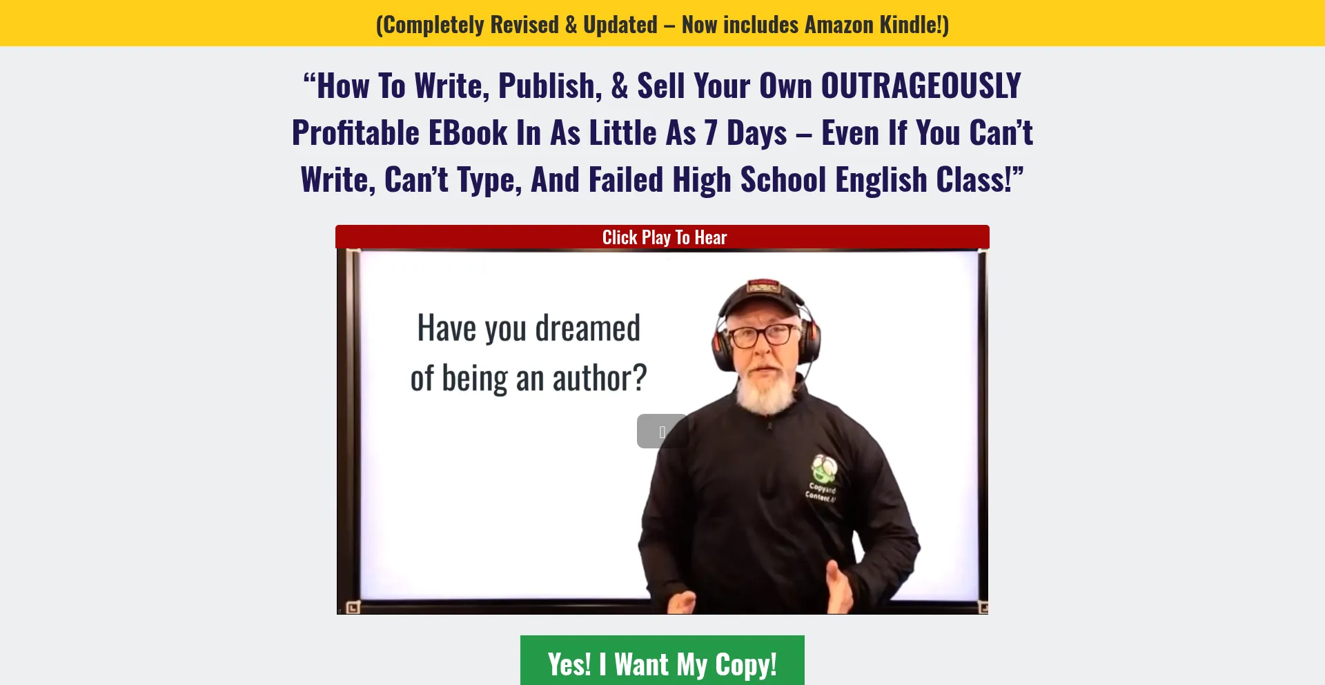 “How to write, publish, & sell your own OUTRAGEOUSLY Profitable eBook in as little as 7 days – even if you can’t write, can’t type and failed high school English class!”