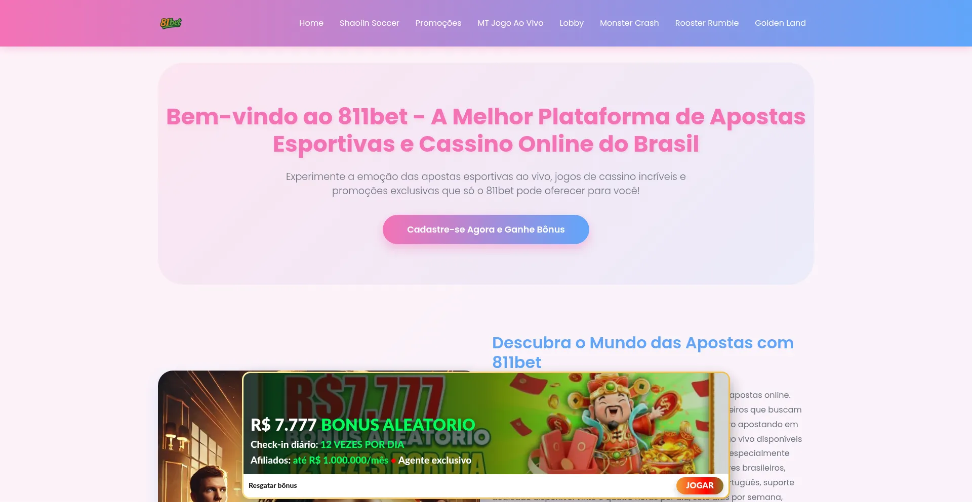 811bet oferece as melhores apostas esportivas, jogos de cassino ao vivo e slots online para jogadores brasileiros. Bônus exclusivos e suporte 24/7.