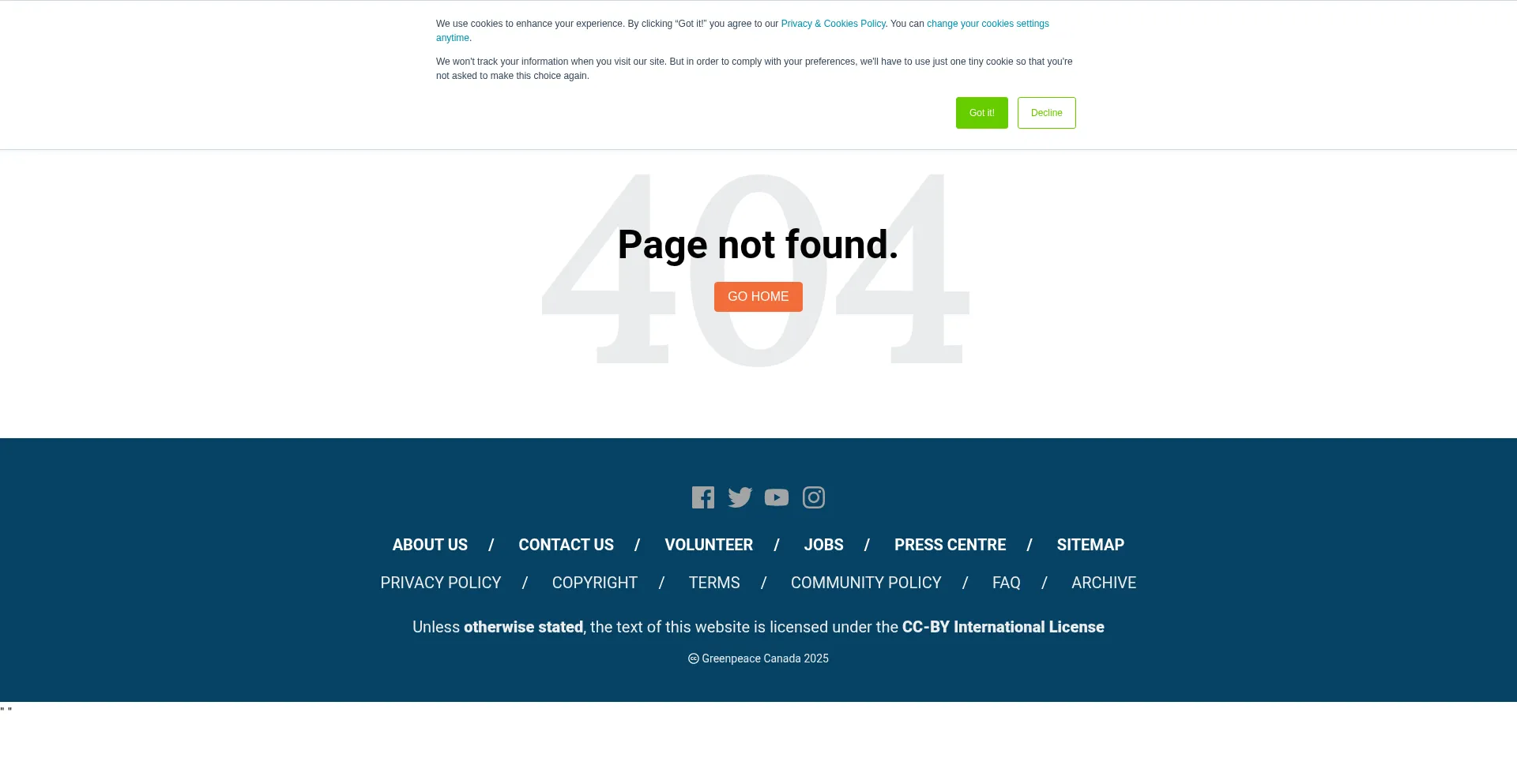 Die Anwesenheit von Social-Media-Links auf der Website deutet darauf hin, dass act.greenpeace.ca offizielle Konten auf Social-Media-Plattformen beibehält, was ein positiver Indikator für Glaubwürdigkeit und Engagement ist.