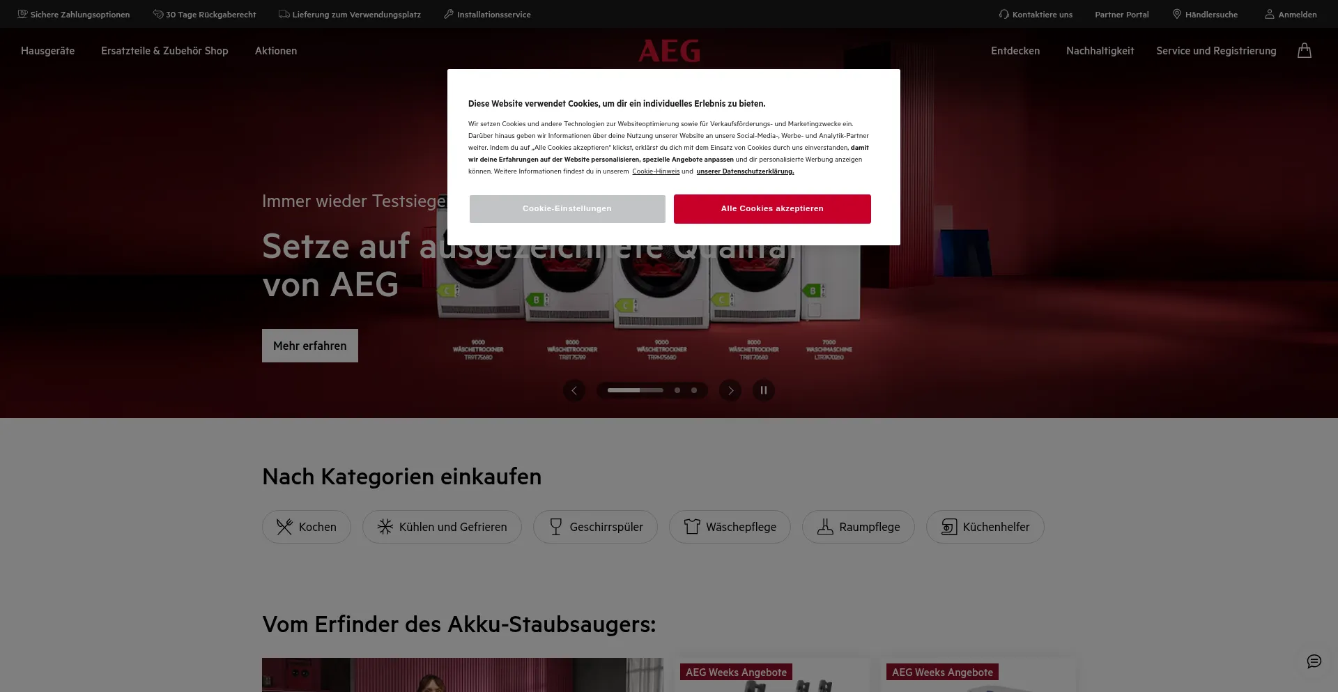 Die Website implementiert Cookie-Zustimmungsmechanismen in Compliance mit Datenschutzregulierungen wie DSGVO oder CCPA. Dies demonstriert, dass aeg.de Datenschutzstandards einhält und Benutzern Kontrolle über persönliche Datenerfassungspraktiken bietet.