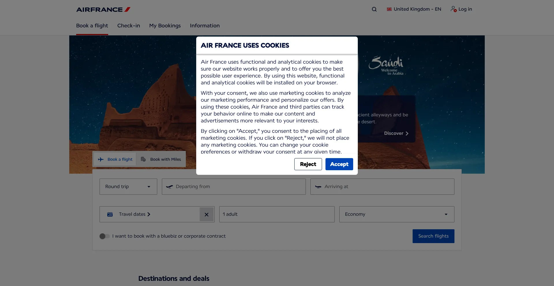 Die Website implementiert Cookie-Zustimmungsmechanismen in Compliance mit Datenschutzregulierungen wie DSGVO oder CCPA. Dies demonstriert, dass airfrance.co.uk Datenschutzstandards einhält und Benutzern Kontrolle über persönliche Datenerfassungspraktiken bietet.