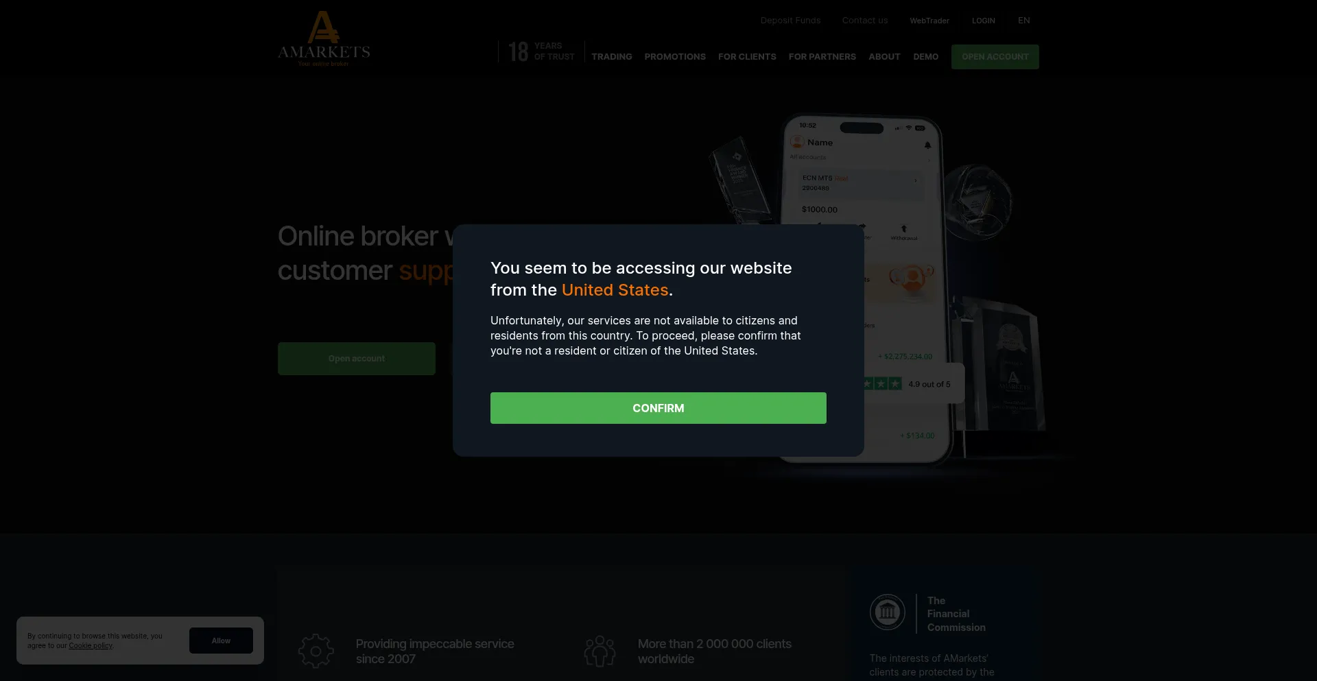 Die Website implementiert Cookie-Zustimmungsmechanismen in Compliance mit Datenschutzregulierungen wie DSGVO oder CCPA. Dies demonstriert, dass amarkets.com Datenschutzstandards einhält und Benutzern Kontrolle über persönliche Datenerfassungspraktiken bietet.