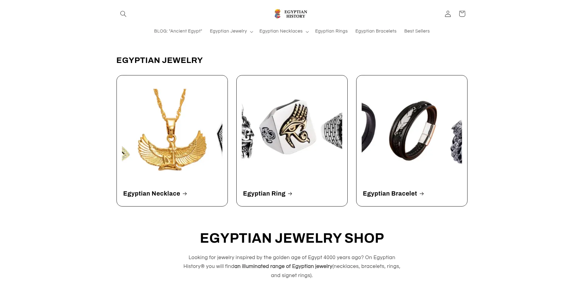Our Egyptian Jewelry (Necklaces, Bracelets and Rings) are for everyone a possibility to bring a well inspired touch of 4000-year-old history to an outfit.