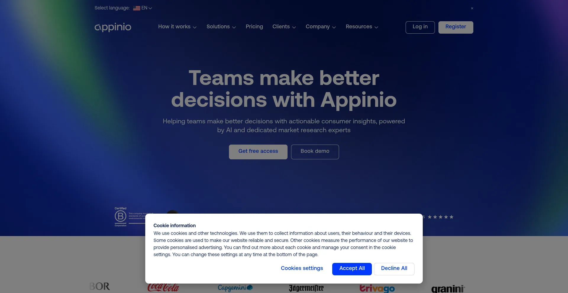 Die Website implementiert Cookie-Zustimmungsmechanismen in Compliance mit Datenschutzregulierungen wie DSGVO oder CCPA. Dies demonstriert, dass appinio.com Datenschutzstandards einhält und Benutzern Kontrolle über persönliche Datenerfassungspraktiken bietet.