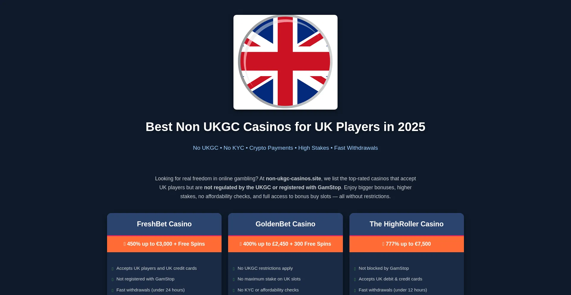 Top non-Gamstop casinos for UK players. No UKGC restrictions, high stakes, crypto, fast withdrawals & no KYC. Play freely in 2025.