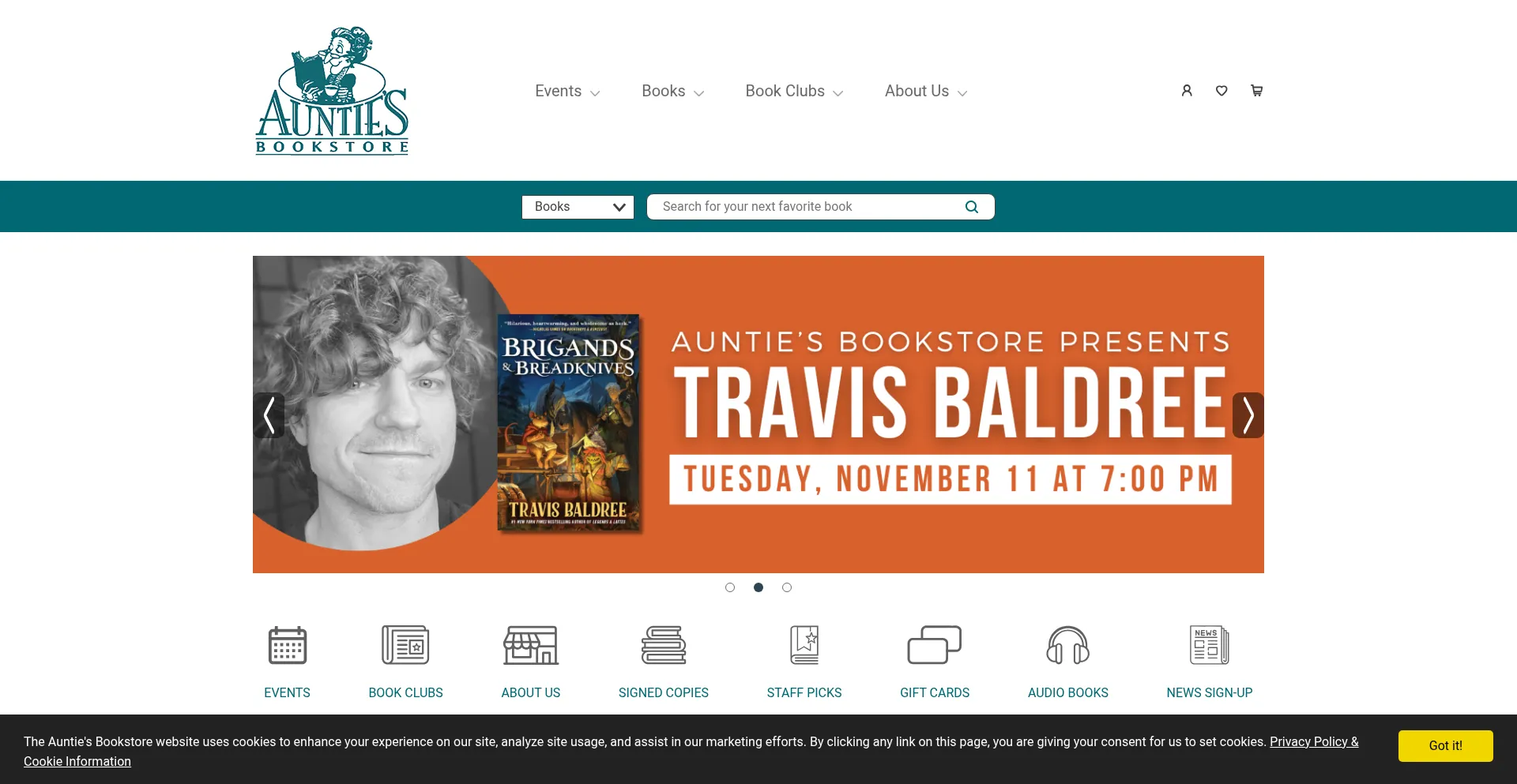 The Auntie's Bookstore website uses cookies to enhance your experience on our site, analyze site usage, and assist in our marketing efforts.
