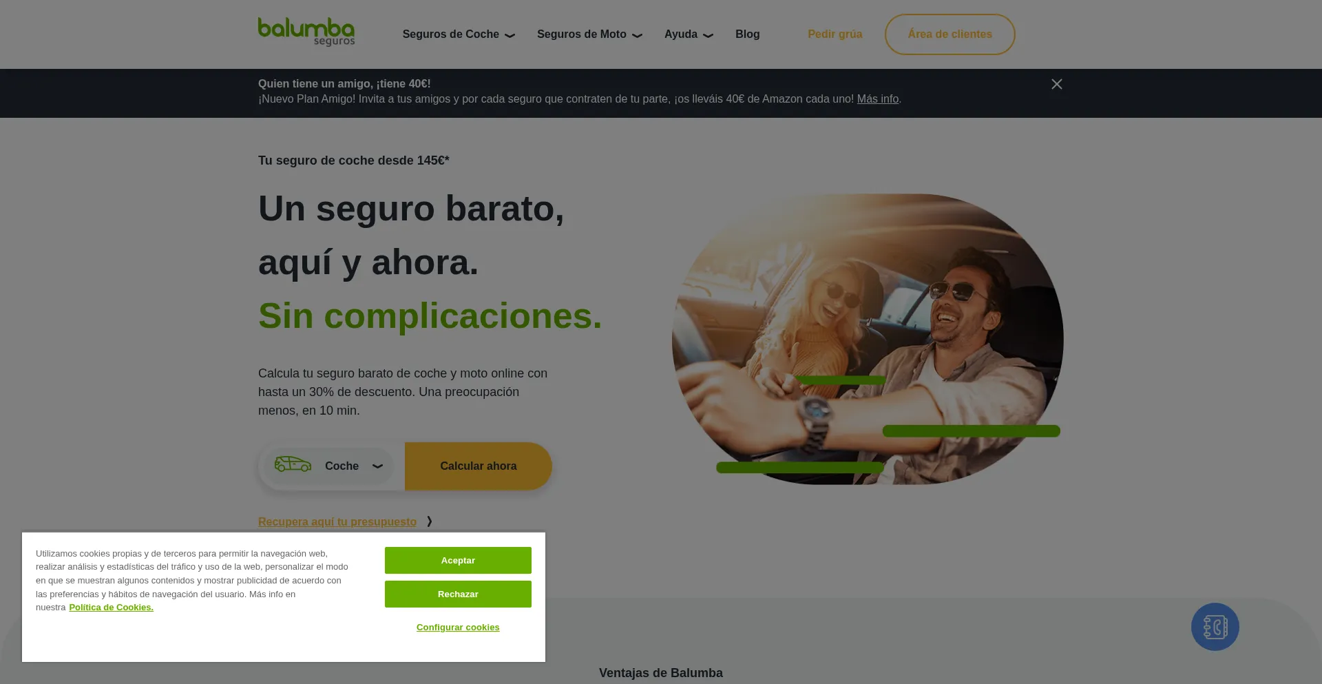 Un seguro barato de coche y moto, aquí y ahora. Sin complicaciones. Calcula tu seguro online con hasta un 30% de descuento.