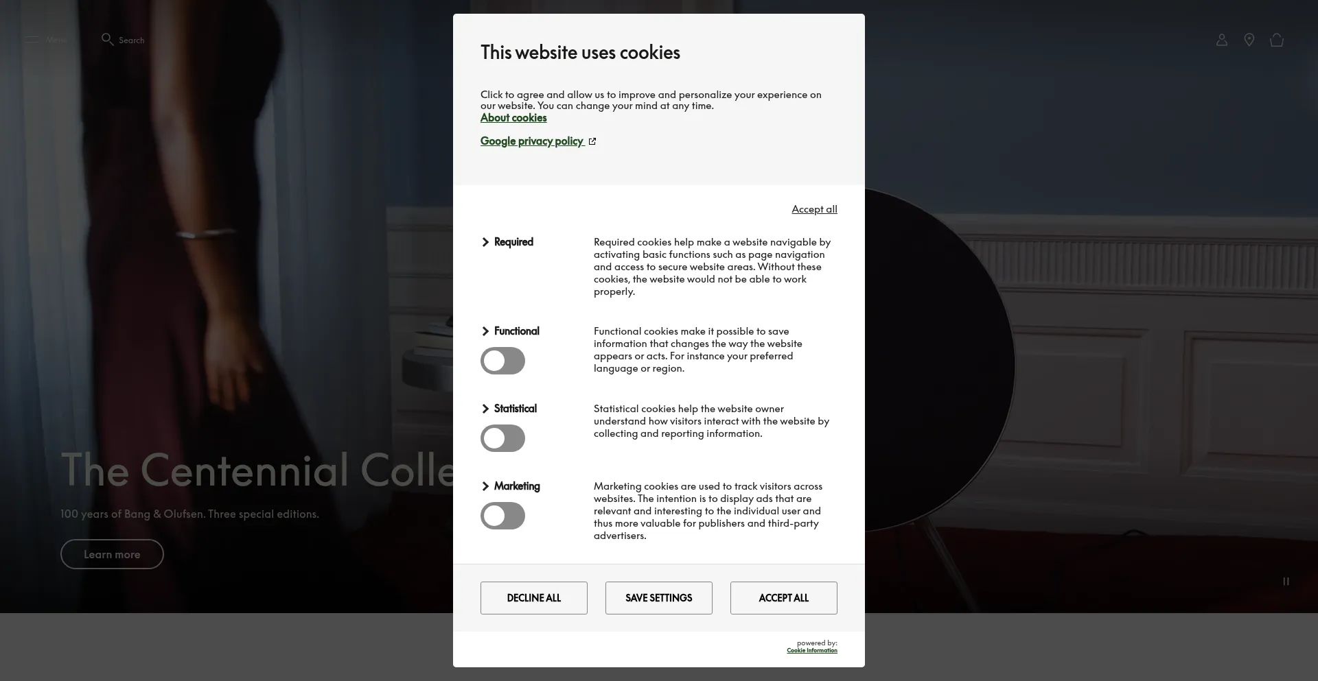 Die Website implementiert Cookie-Zustimmungsmechanismen in Compliance mit Datenschutzregulierungen wie DSGVO oder CCPA. Dies demonstriert, dass bang-olufsen.com Datenschutzstandards einhält und Benutzern Kontrolle über persönliche Datenerfassungspraktiken bietet.