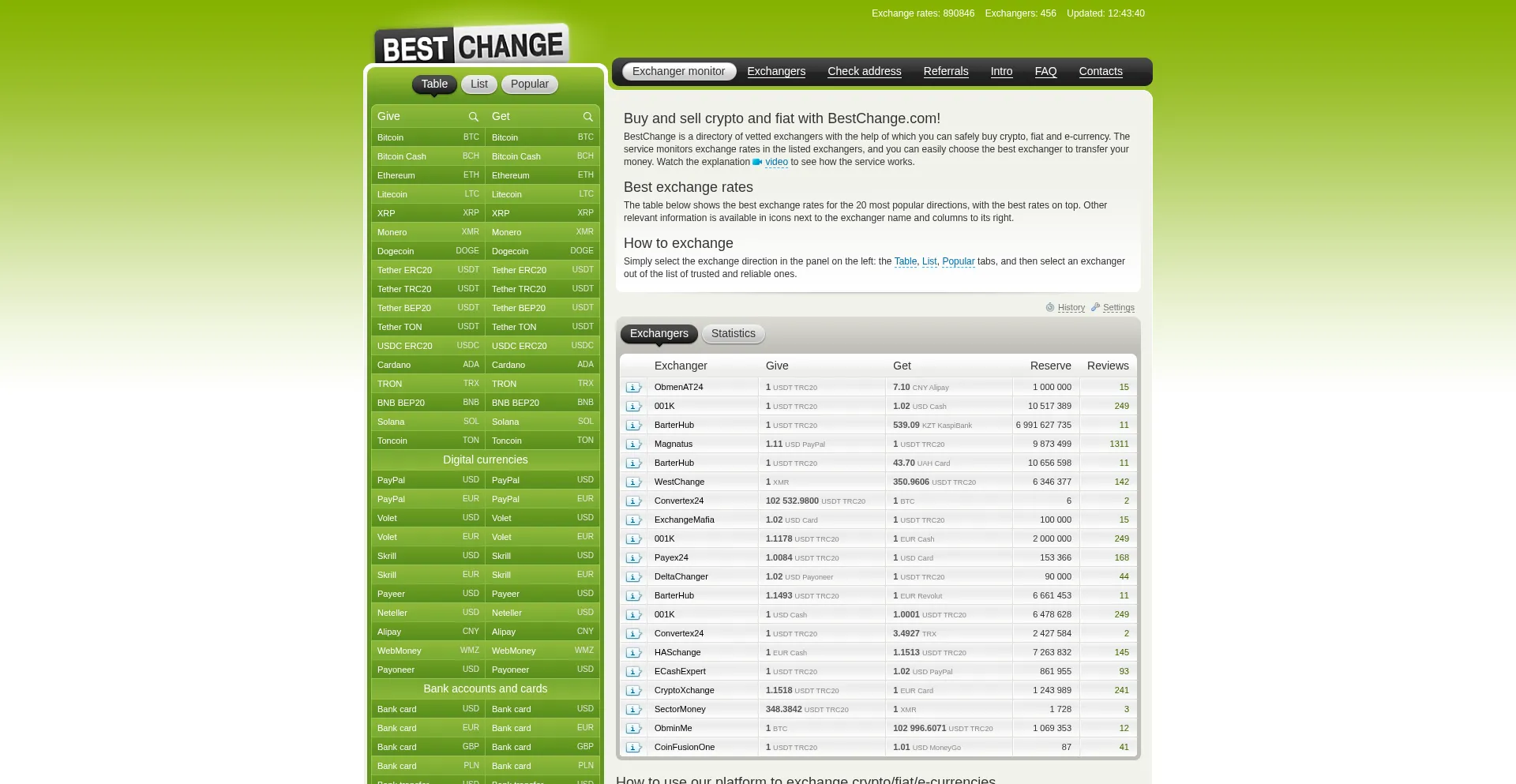 Exchanger directory displays rates from the best crypto, fiat and e-currency exchangers. Find where to buy or sell BTC, ETH and other crypto!