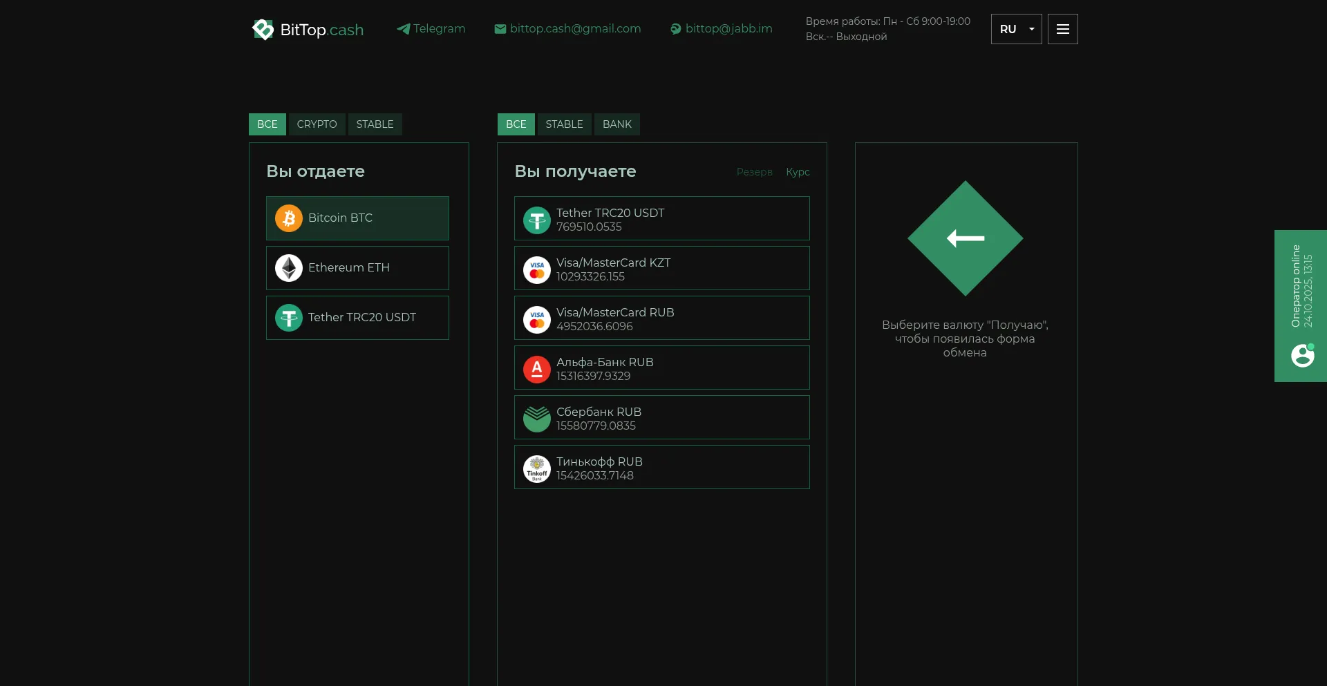 Bittop.cash - Обмен популярных криптовалют, банки, RUB, KZT