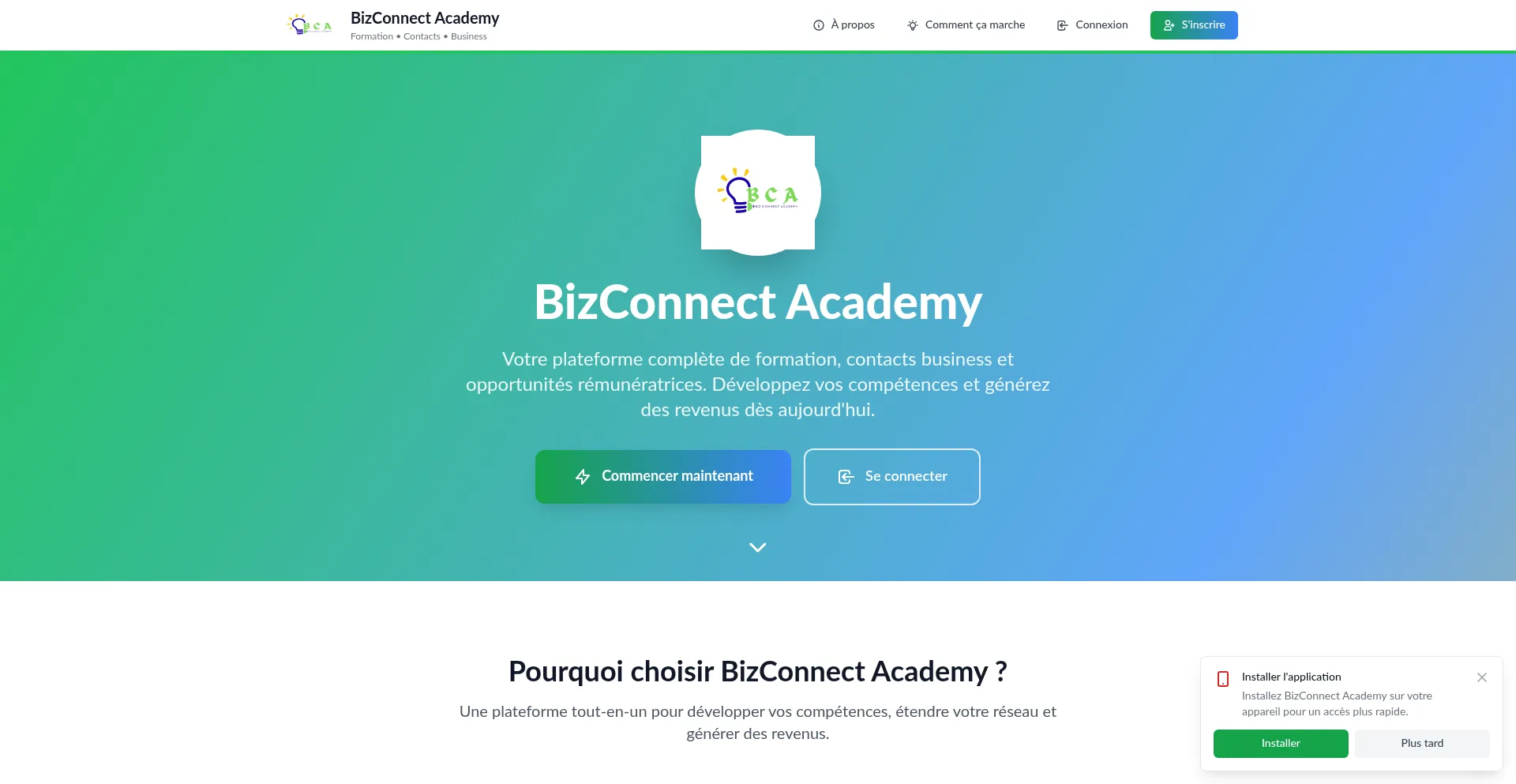 Votre plateforme complète de formation, contacts business et opportunités rémunératrices. Développez vos compétences et générez des revenus dès aujourd'hui.