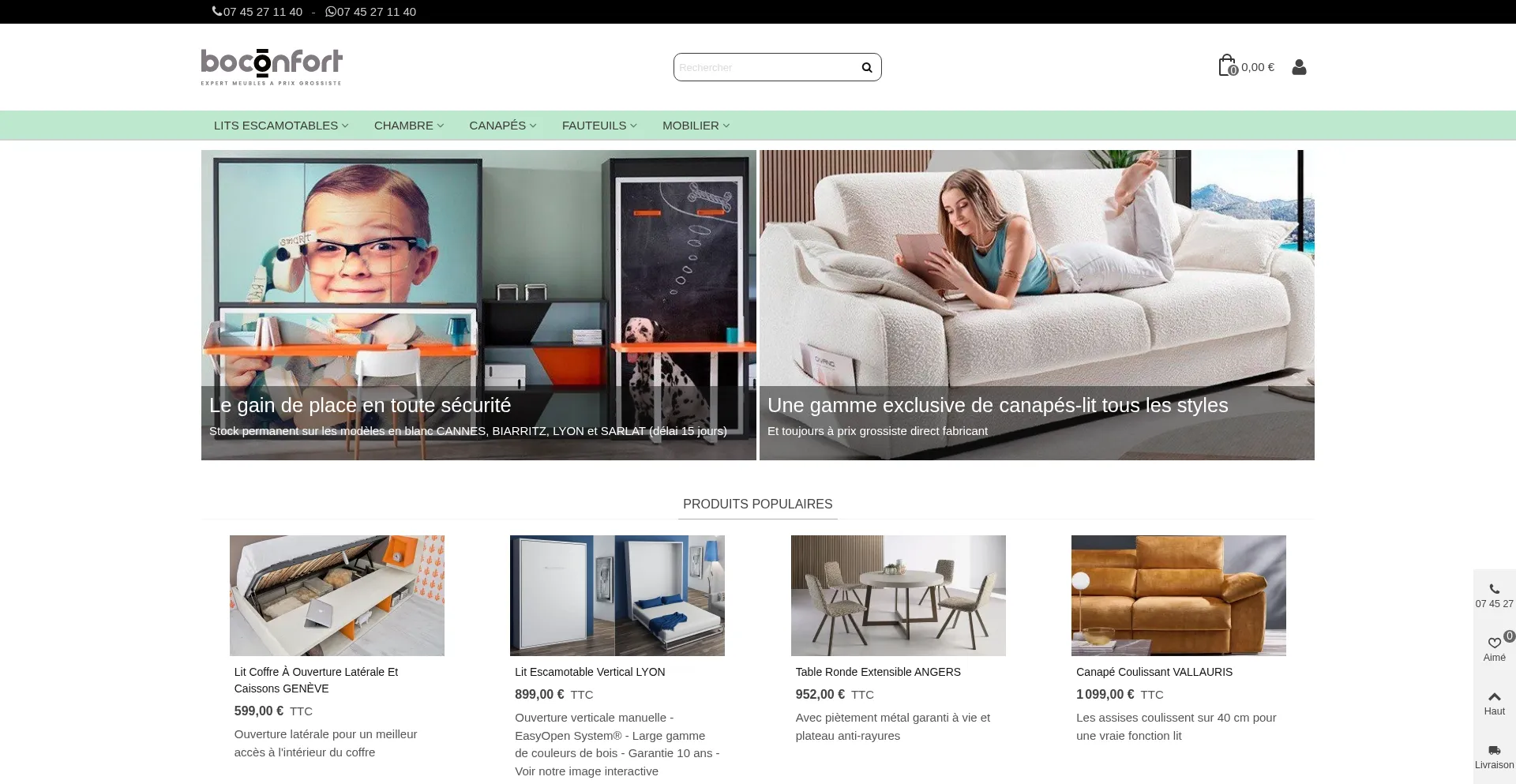 Vente de lits coffres, lits escamotables, canapés-lits. Spécialiste de literie et mobilier gain de place