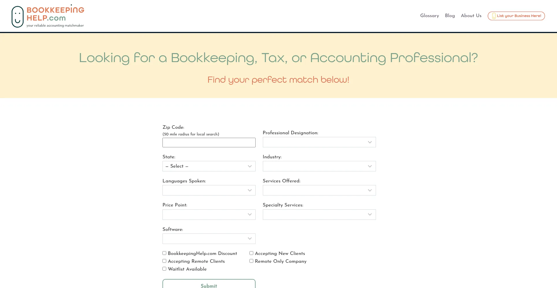 Looking for a Bookkeeping, Tax, &/or Accounting Professional? Find your perfect match on our website! Enter your info to find an accountant!
