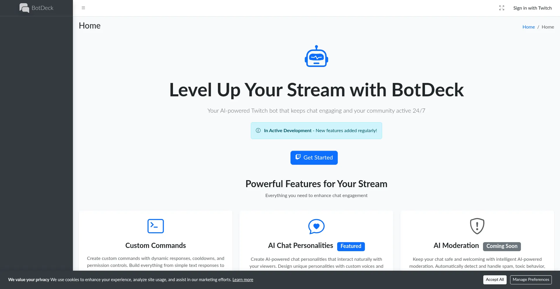 BotDeck - AI-powered Twitch bot management platform. Create custom commands, deploy AI chat personalities, and enhance your stream with intelligent 24/7 chat engagement.