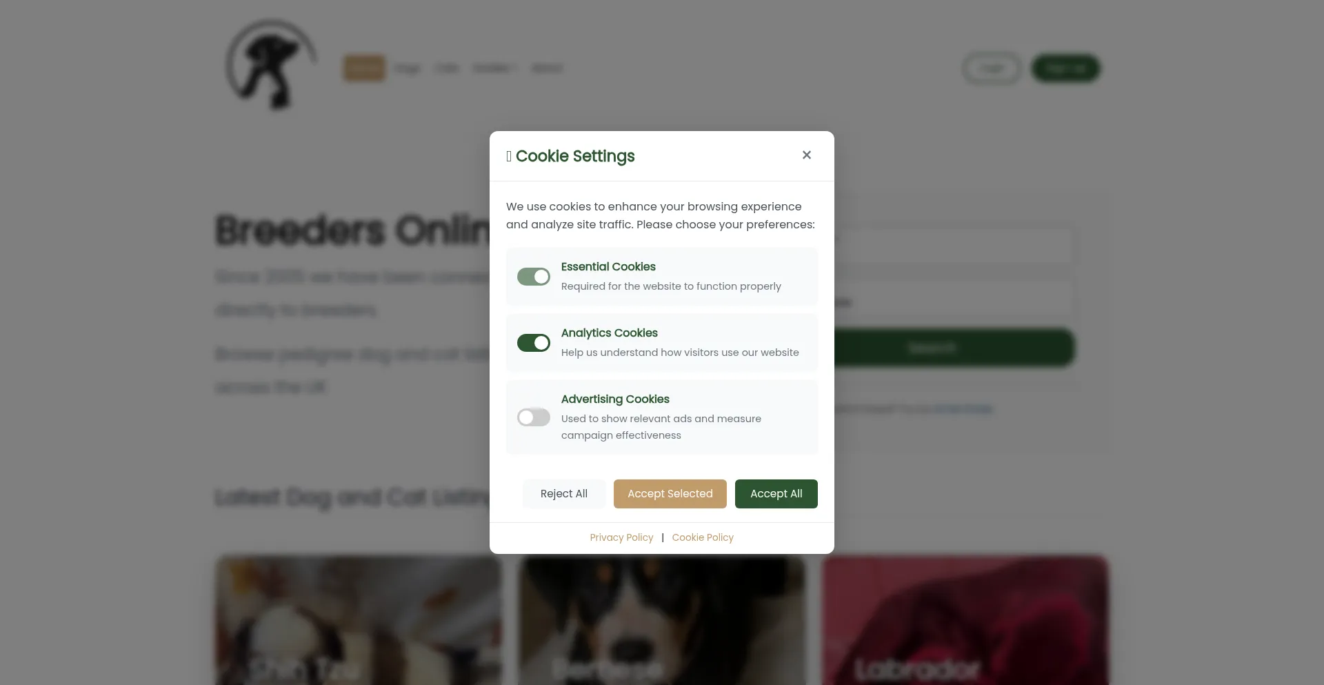 Die Website implementiert Cookie-Zustimmungsmechanismen in Compliance mit Datenschutzregulierungen wie DSGVO oder CCPA. Dies demonstriert, dass breedersonline.co.uk Datenschutzstandards einhält und Benutzern Kontrolle über persönliche Datenerfassungspraktiken bietet.