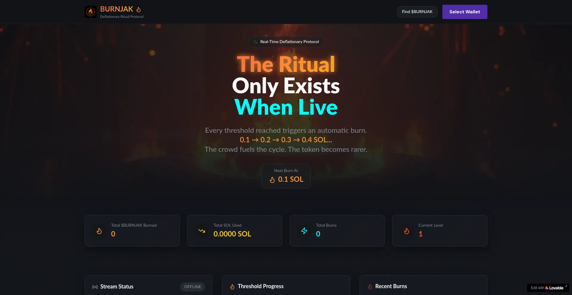 The deflationary ritual that only exists when the stream is alive. Each threshold triggers automatic $BURNJAK burns on Solana.