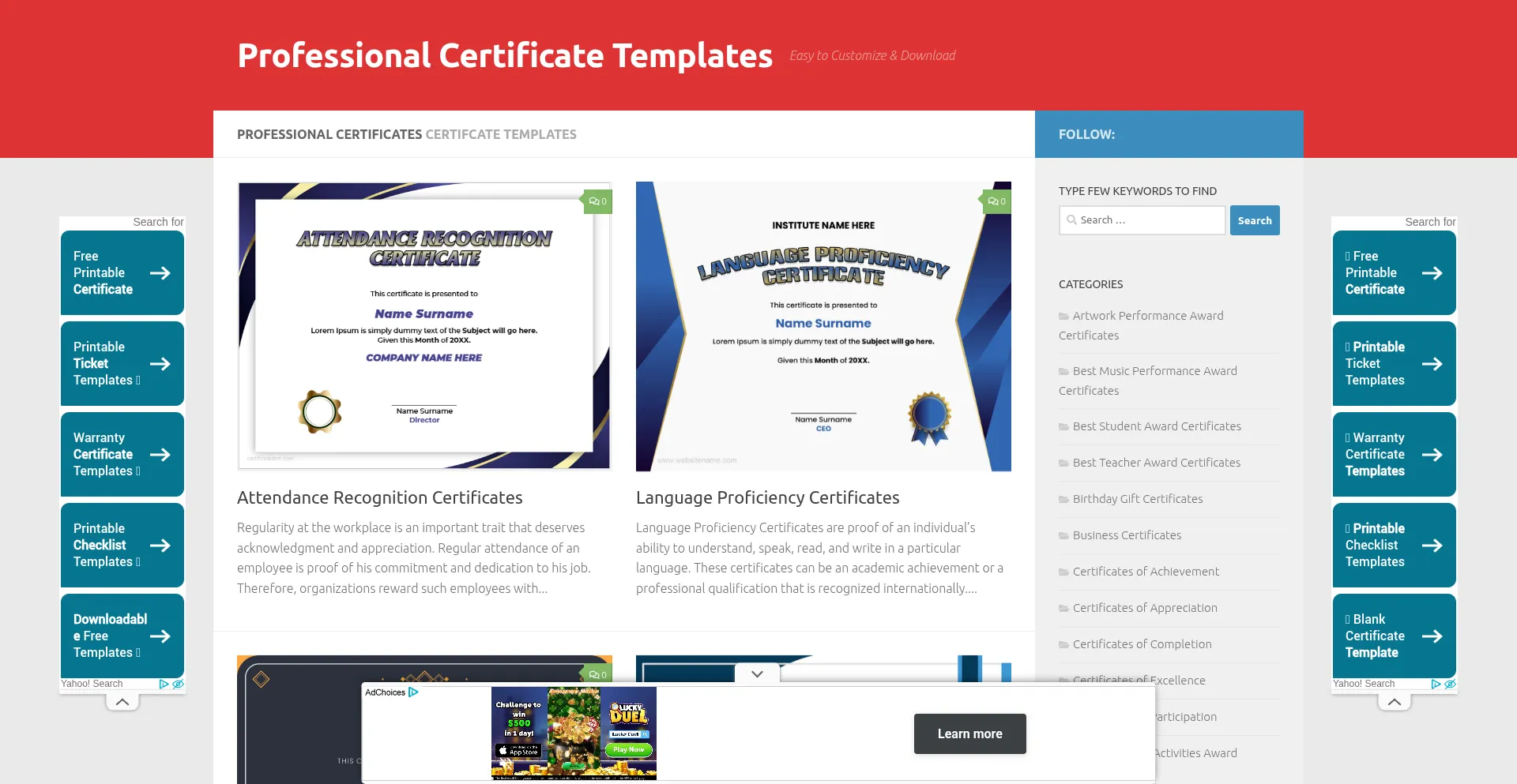The website offer readymade, Editable & printable certificate templates. All templates are designed by professionals and are free to download for personal use.