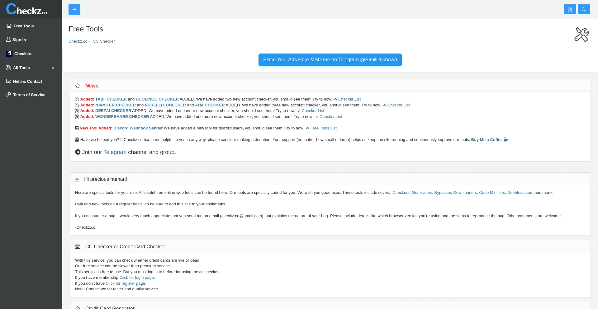 Checkz.co provides free online tools including credit card checkers, generators, Spotify & Netflix account checkers, and other powerful web utilities.