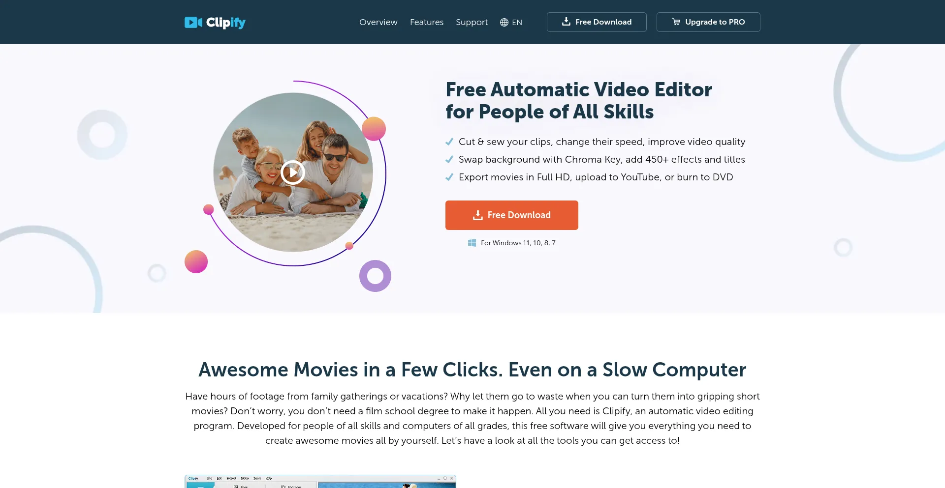 Create movies with Clipify, best free automatic video editor: ✔ cut & glue footage ✔ add music & 150+ effects ✔ swap video backgrounds!