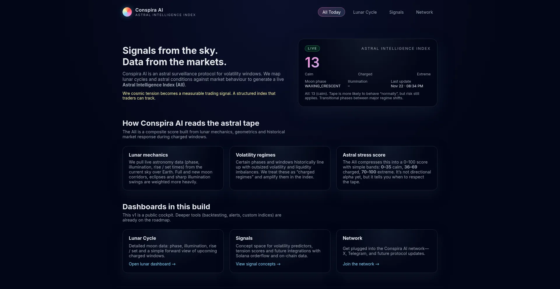 Conspira AI maps lunar cycles and astral conditions against market volatility to create an Astral Intelligence Index for crypto and macro traders.