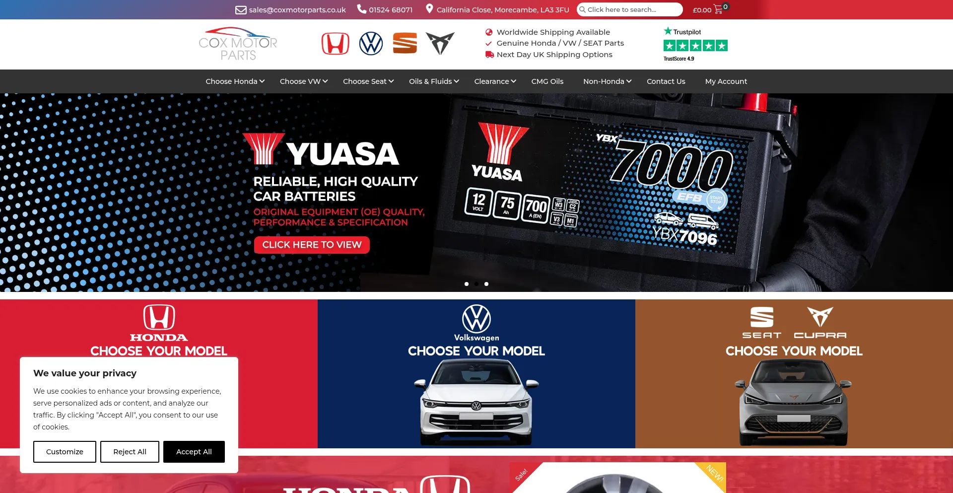 Genuine Honda parts at discounted prices. Buy online today or call us on 01524 68071. We will never be beaten on price for any genuine Honda car parts.