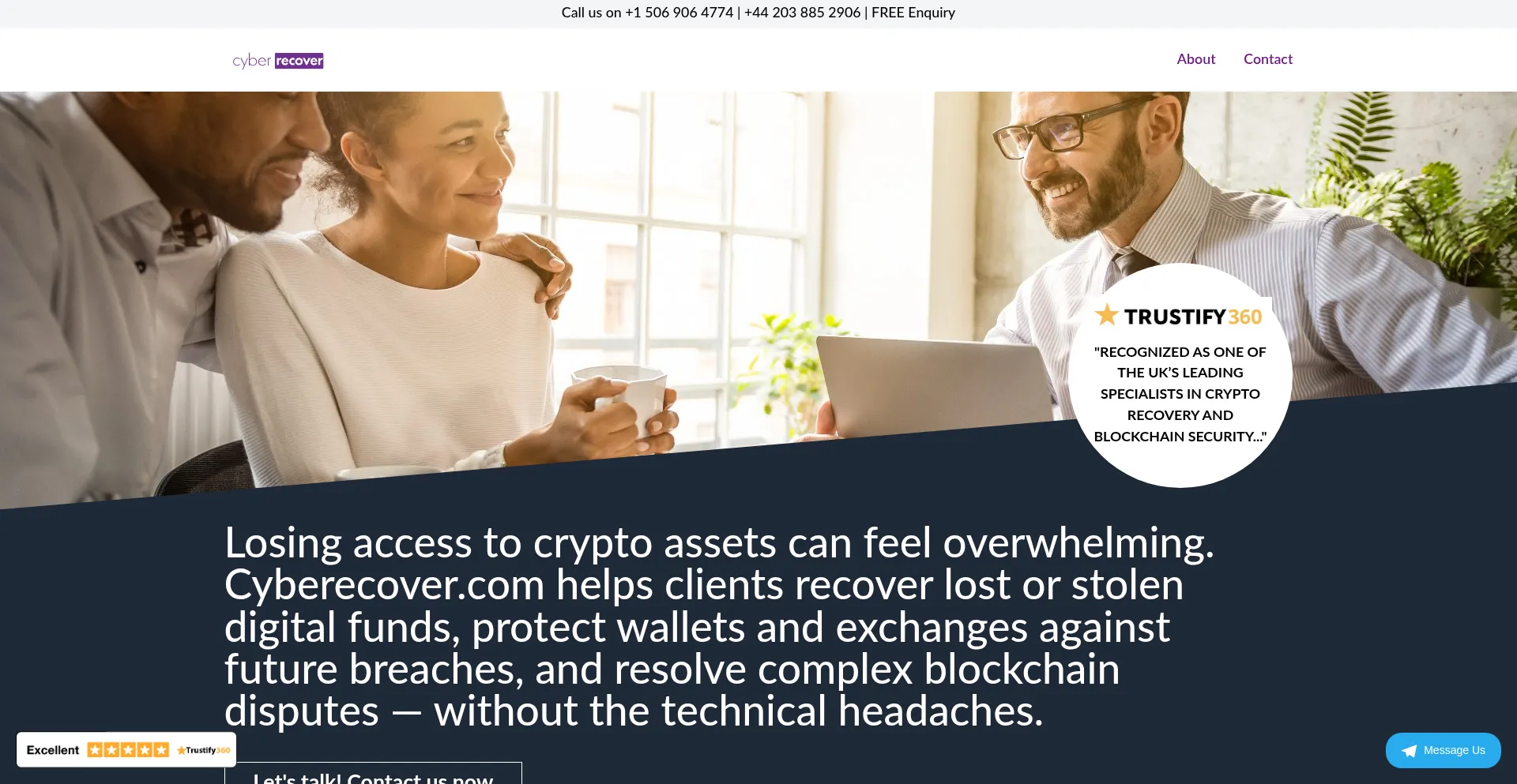 Die Website cyberecover.net bewirbt Fondswiederherstellungsdienste für verlorene oder gestohlene Vermögenswerte. Während einige auf Erfolgshonorarbasis operieren, können andere Vorauszahlungen erfordern, was auf betrügerische Operationen hinweisen kann. Verifizieren Sie Anmeldeinformationen und regulatorische Compliance, bevor Sie solche Dienste in Anspruch nehmen.