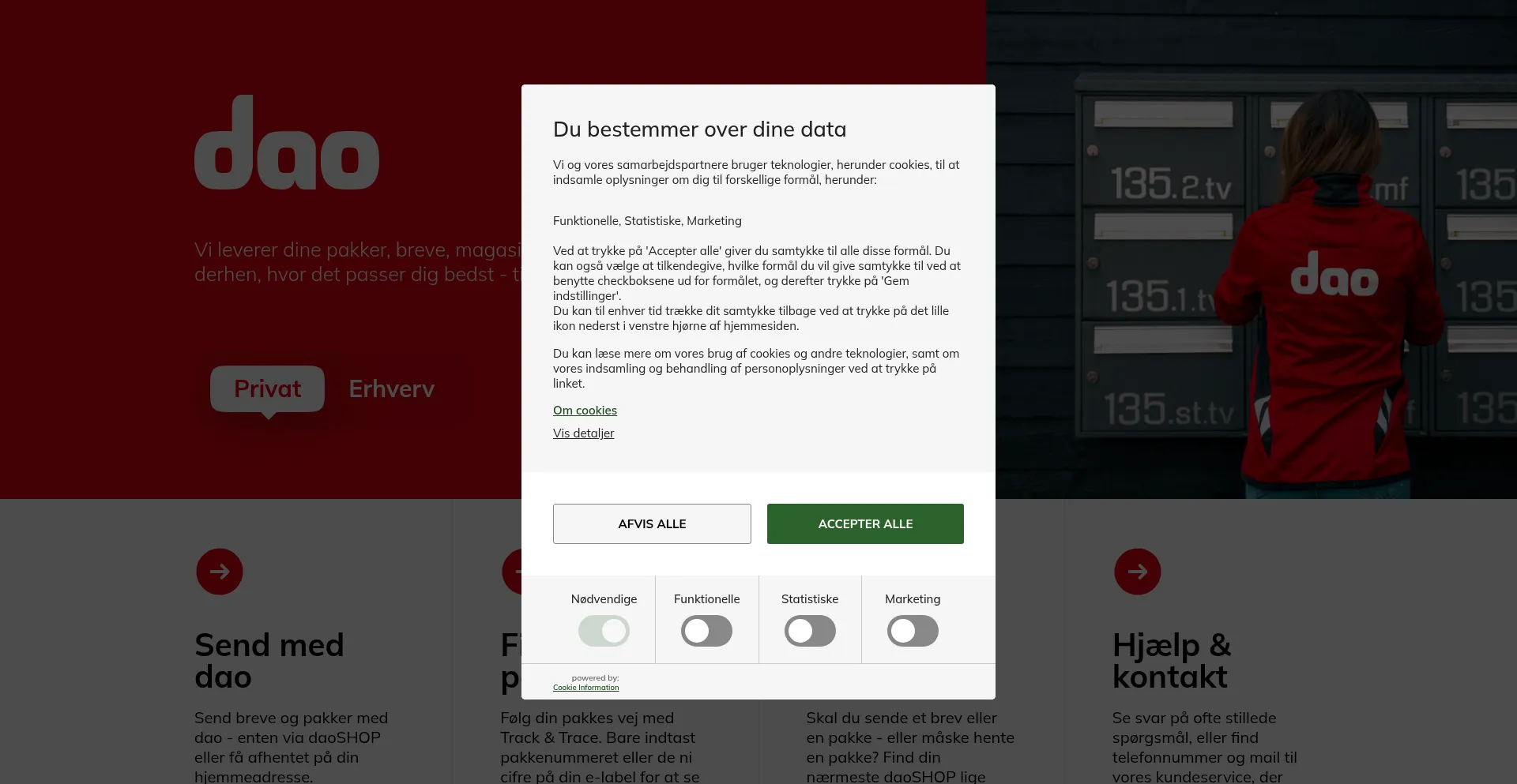 Som privat kan du sende og modtage pakker og breve med dao. Find nærmeste dao pakkeshop, track din pakke, få hjælp eller kontakt os her.