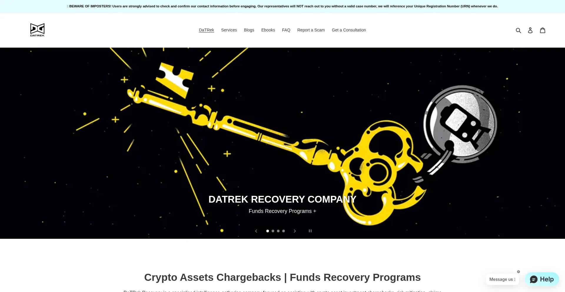 Die Website datrekrecoverycompany.com bewirbt Fondswiederherstellungsdienste für verlorene oder gestohlene Vermögenswerte. Während einige auf Erfolgshonorarbasis operieren, können andere Vorauszahlungen erfordern, was auf betrügerische Operationen hinweisen kann. Verifizieren Sie Anmeldeinformationen und regulatorische Compliance, bevor Sie solche Dienste in Anspruch nehmen.