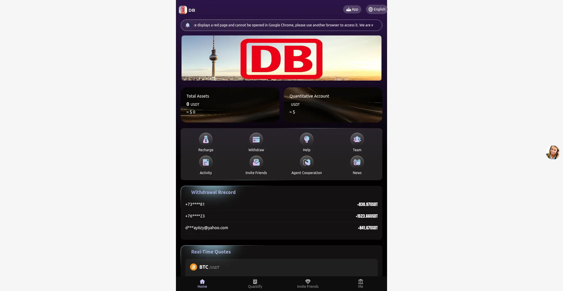 Die Plattform implementiert Social-Engineering-Techniken, die häufig mit Finanzbetrugoperationen verbunden sind, und zielt auf Opfer durch falsche Investitionsversprechen und betrügerische Finanzdienstleistungen ab. Benutzer sollten umfassende Due Diligence durchführen und die Legitimität der Plattform überprüfen, bevor sie sich an Finanztransaktionen beteiligen oder sensible Informationen teilen.