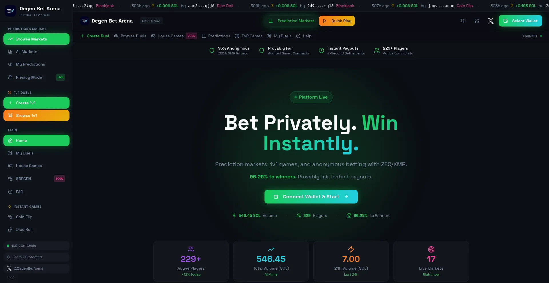 Prediction markets, 1v1 games, and anonymous betting with ZEC/XMR. 96.25% to winners. Provably fair. Instant payouts.