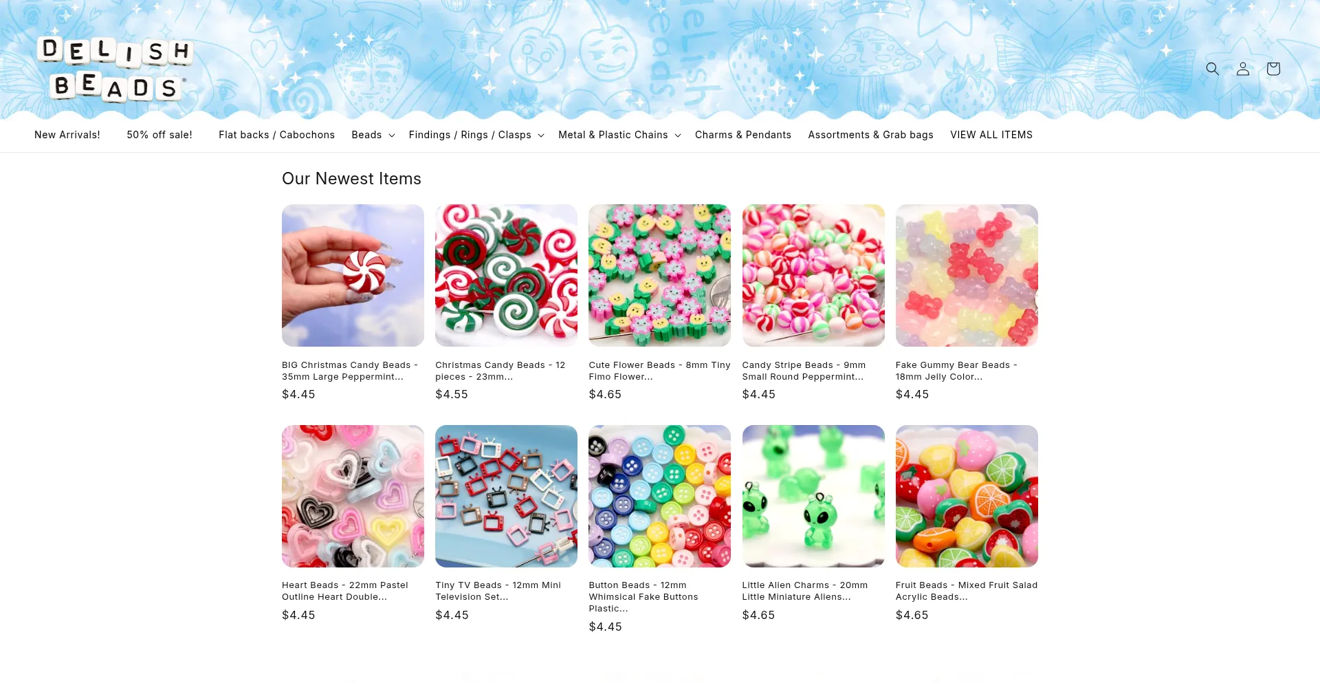 We sell chunky acrylic beads, cute resin cabochons and flatbacks, colorful enamel or plastic chain and other fun craft supplies.