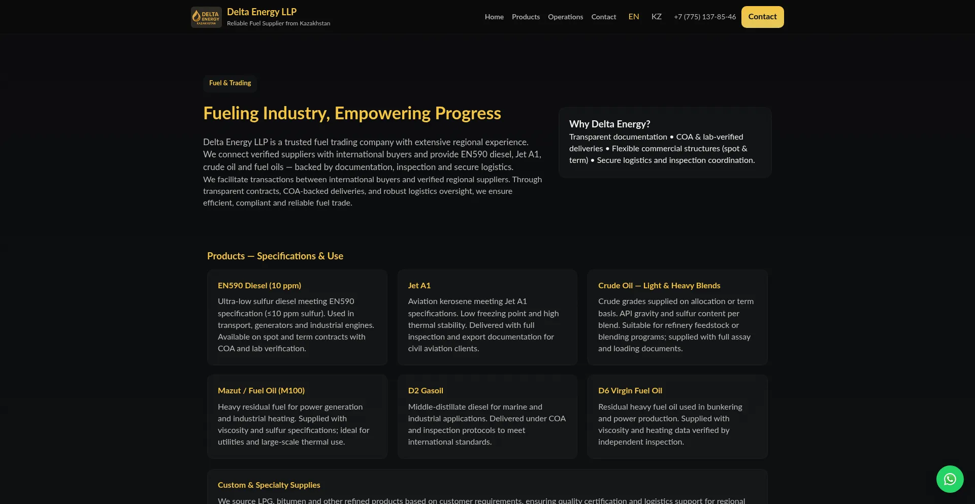 Delta Energy LLP supplies EN590 diesel, Jet A1, crude oil, mazut, D2 and D6 fuel oils from Kazakhstan. We facilitate trade with transparent documentation, COA-backed deliveries ...
