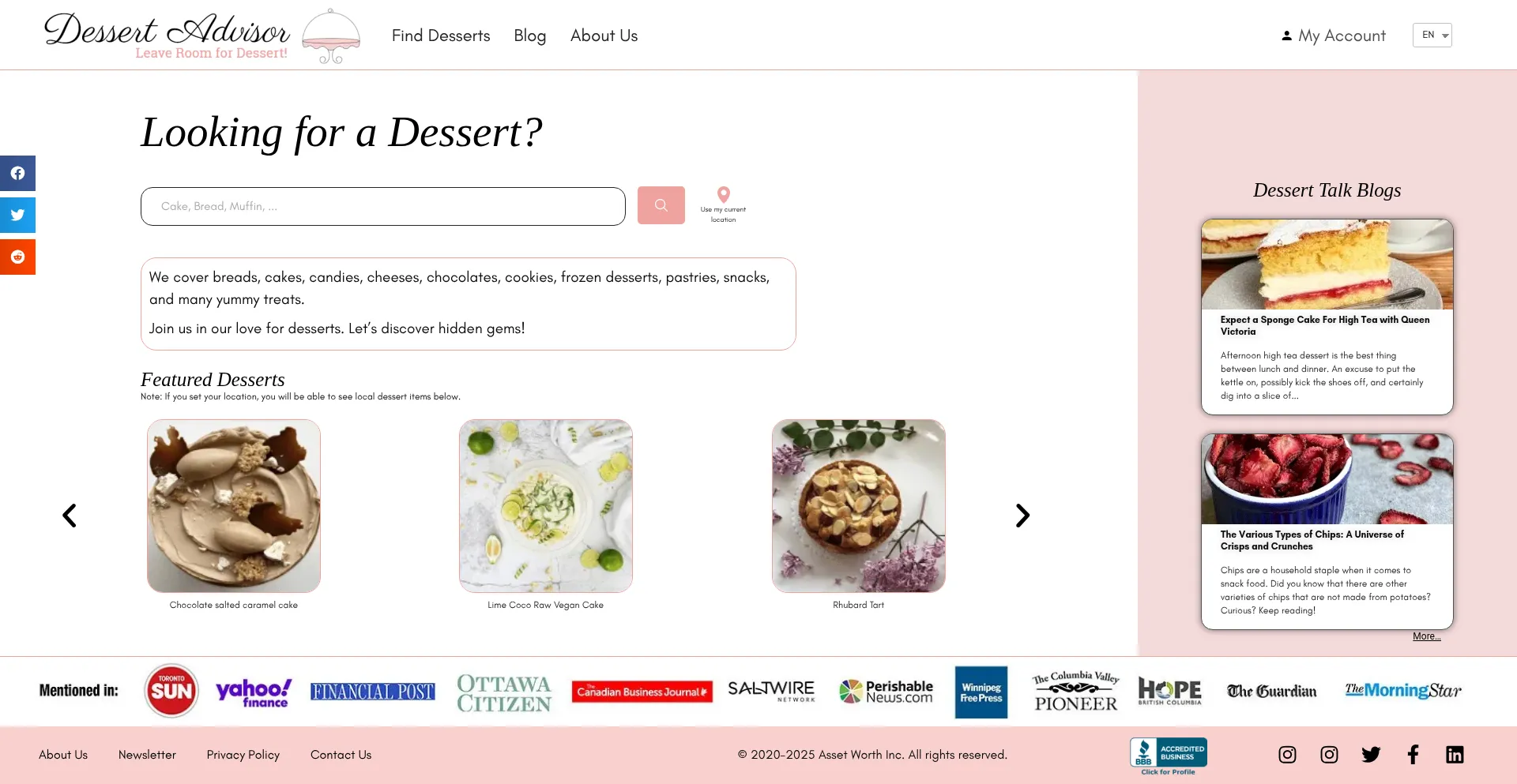 Die Anwesenheit von Social-Media-Links auf der Website deutet darauf hin, dass dessertadvisor.com offizielle Konten auf Social-Media-Plattformen beibehält, was ein positiver Indikator für Glaubwürdigkeit und Engagement ist.