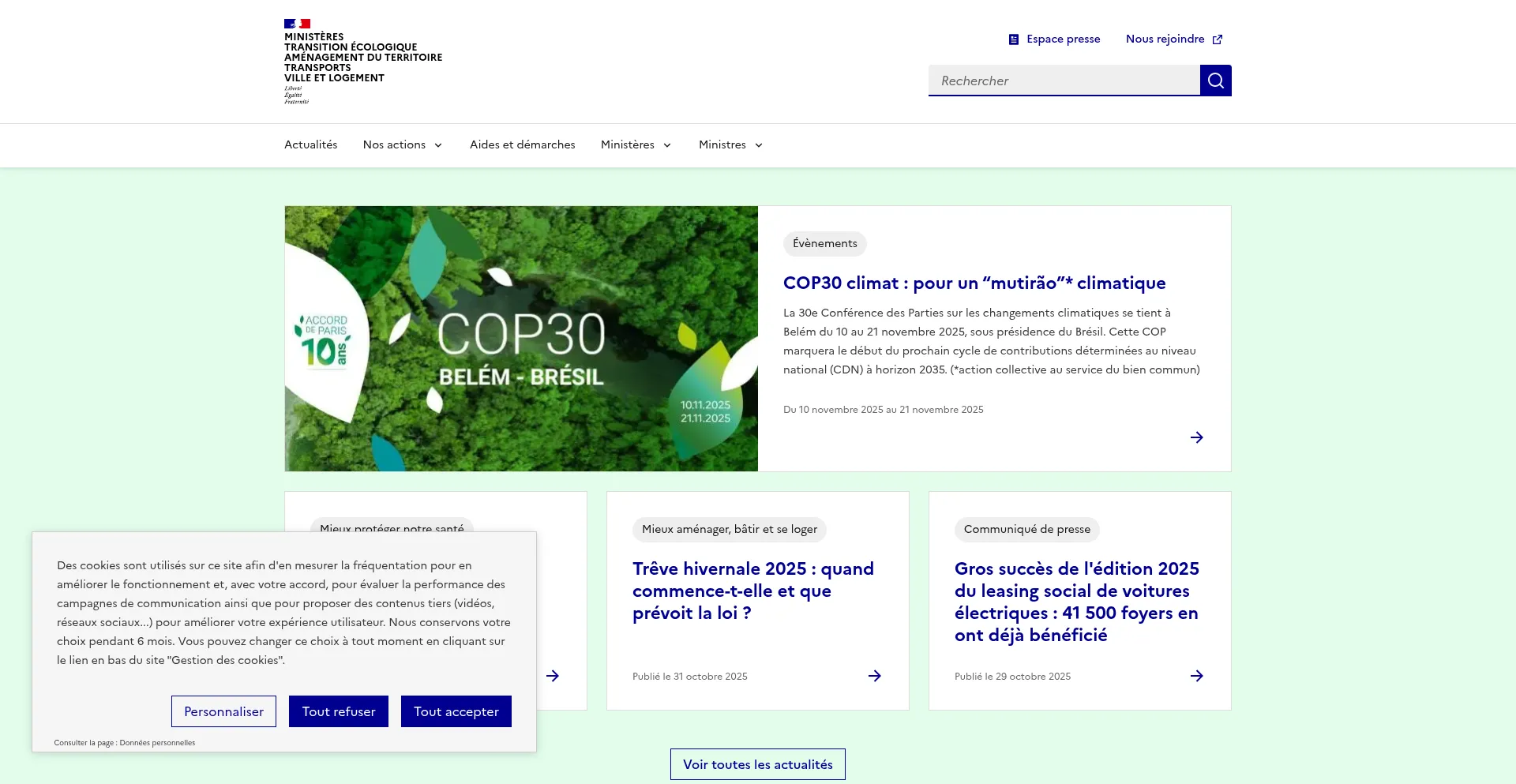Site du ministère de la Transition écologique, de la Biodiversité et des Négociations internationales sur le climat et la nature, du ministère de l’Aménagement du territ...