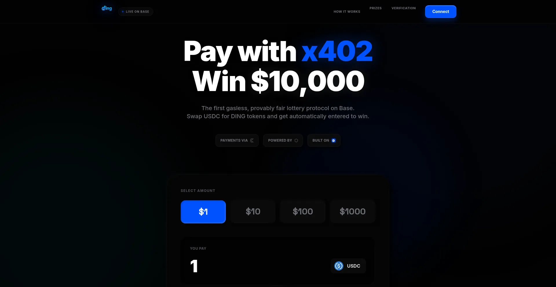 Swap USDC for DING and enter the first gasless, provably fair lottery on Base. Win up to $10,000 instantly. Powered by x402 and Chainlink VRF v2.5.