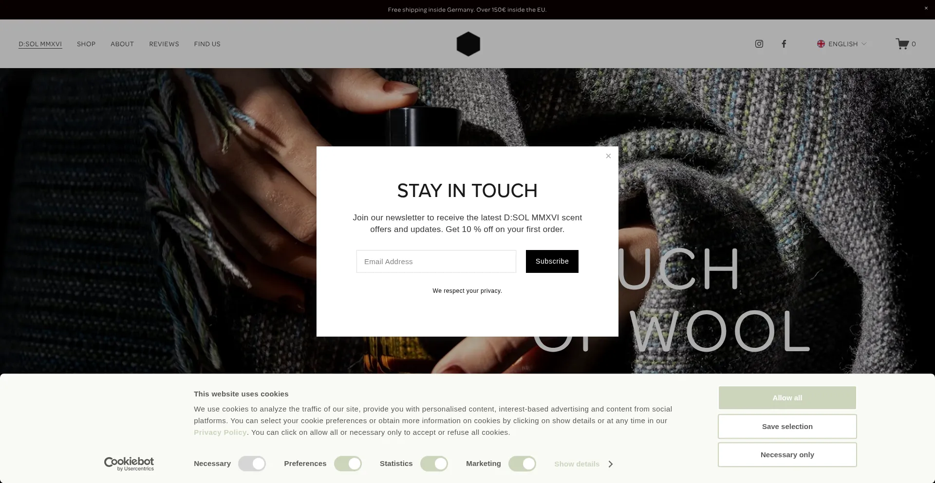 Die Website implementiert Cookie-Zustimmungsmechanismen in Compliance mit Datenschutzregulierungen wie DSGVO oder CCPA. Dies demonstriert, dass dsolperfumes.com Datenschutzstandards einhält und Benutzern Kontrolle über persönliche Datenerfassungspraktiken bietet.