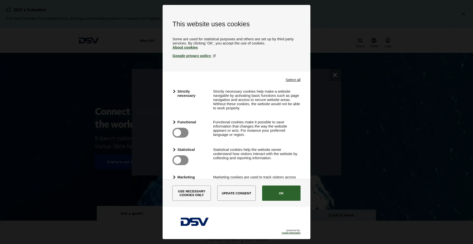 Die Website implementiert Cookie-Zustimmungsmechanismen in Compliance mit Datenschutzregulierungen wie DSGVO oder CCPA. Dies demonstriert, dass dsv.com Datenschutzstandards einhält und Benutzern Kontrolle über persönliche Datenerfassungspraktiken bietet.
