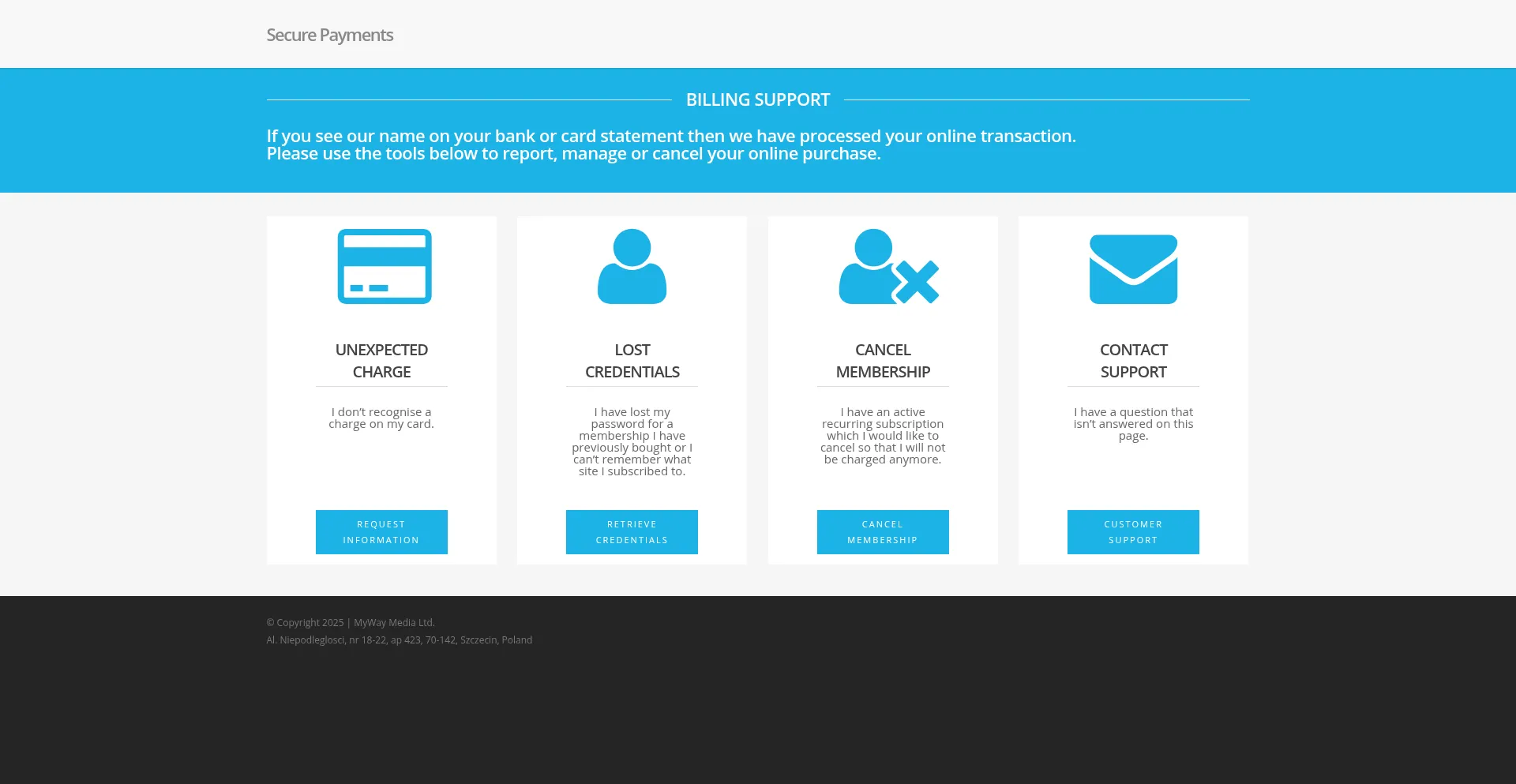 Die Website enthält dedizierte Bereiche zur Behandlung von Zahlungsstreitigkeiten, Abonnementverwaltung, Rückbuchungsverfahren, Rückerstattungsrichtlinien und anderen finanziellen Transaktionsanliegen, was etablierte Abrechnungsoperationen anzeigt.