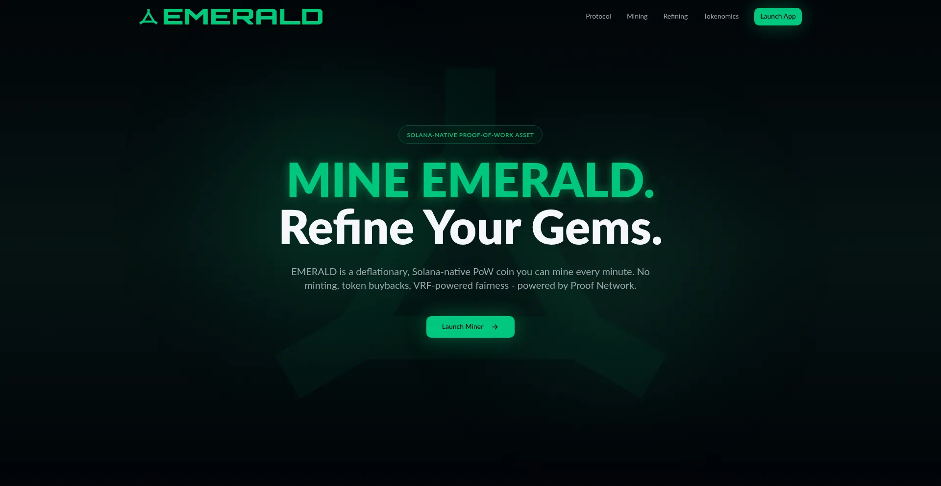 EMERALD is a minable, Solana-native 'proof of work' coin. Inspired by ORE but fully DEFLATIONARY, EMERALD does NOT utilize MINTING, just a VRF mining system, refining & token bu...