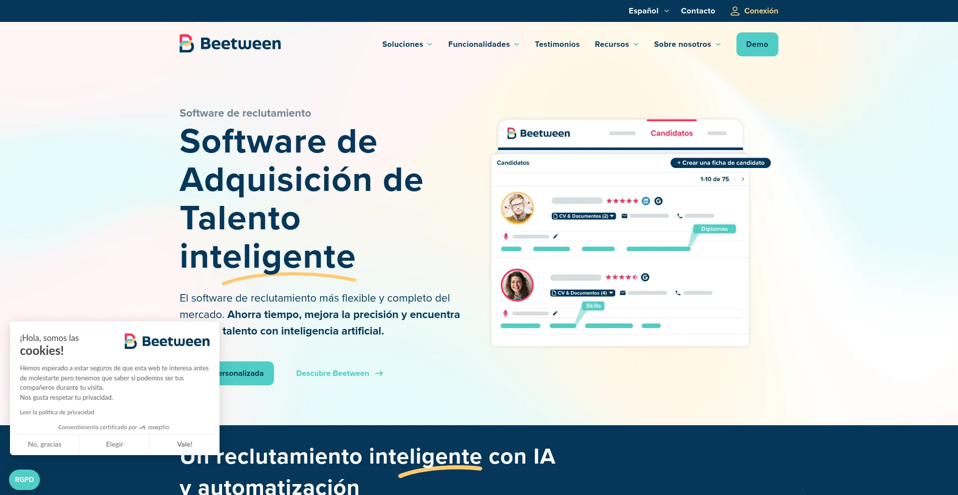 Beetween es el Software de reclutamiento más completo del mercado. Automatiza tus procesos, haz brillar tu employer branding y recluta de manera colaborativa