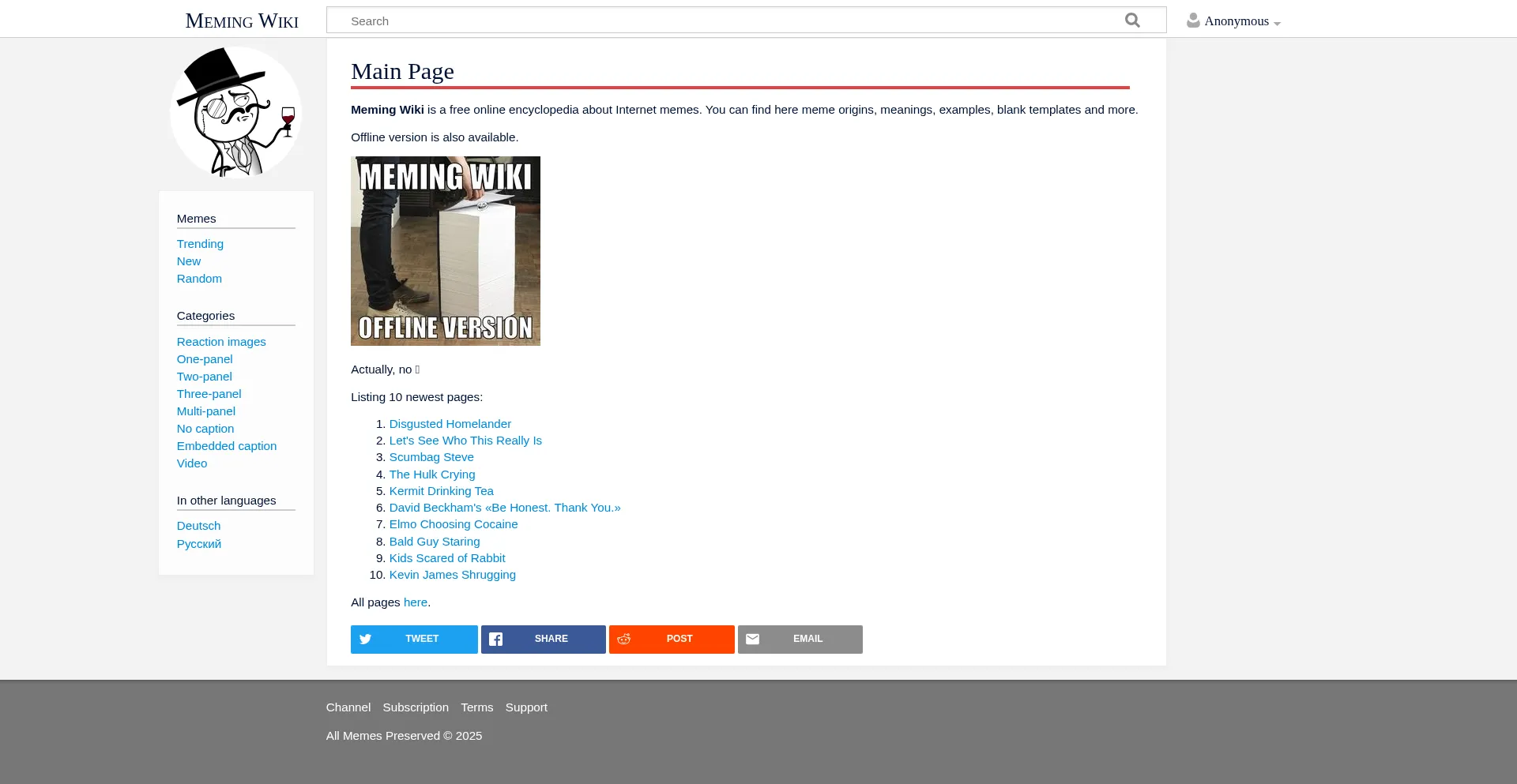 Meming Wiki is a free online encyclopedia about Internet memes. You can find here meme origins, meanings, examples, blank templates and more.
