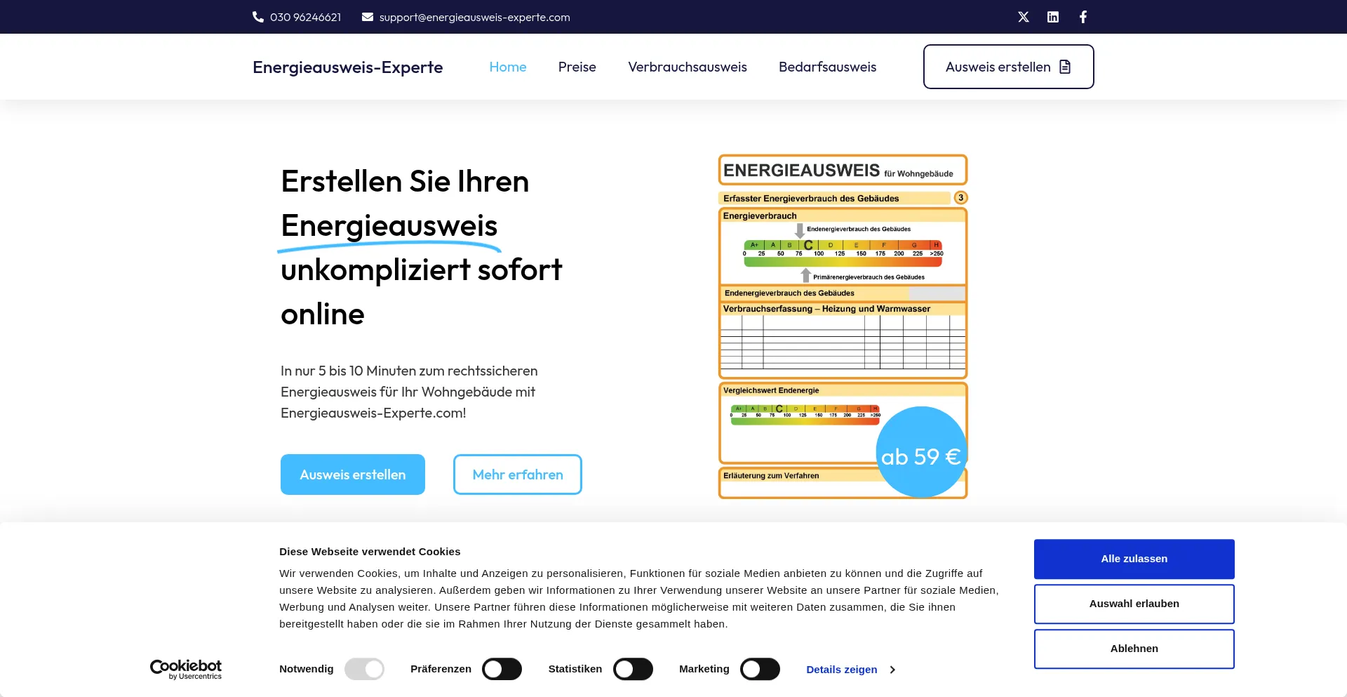 Energieausweis online erstellen: Bedarfsausweis oder Verbrauchsausweis – schnell, rechtssicher und komplett digital. Beratung: 030 96246621.