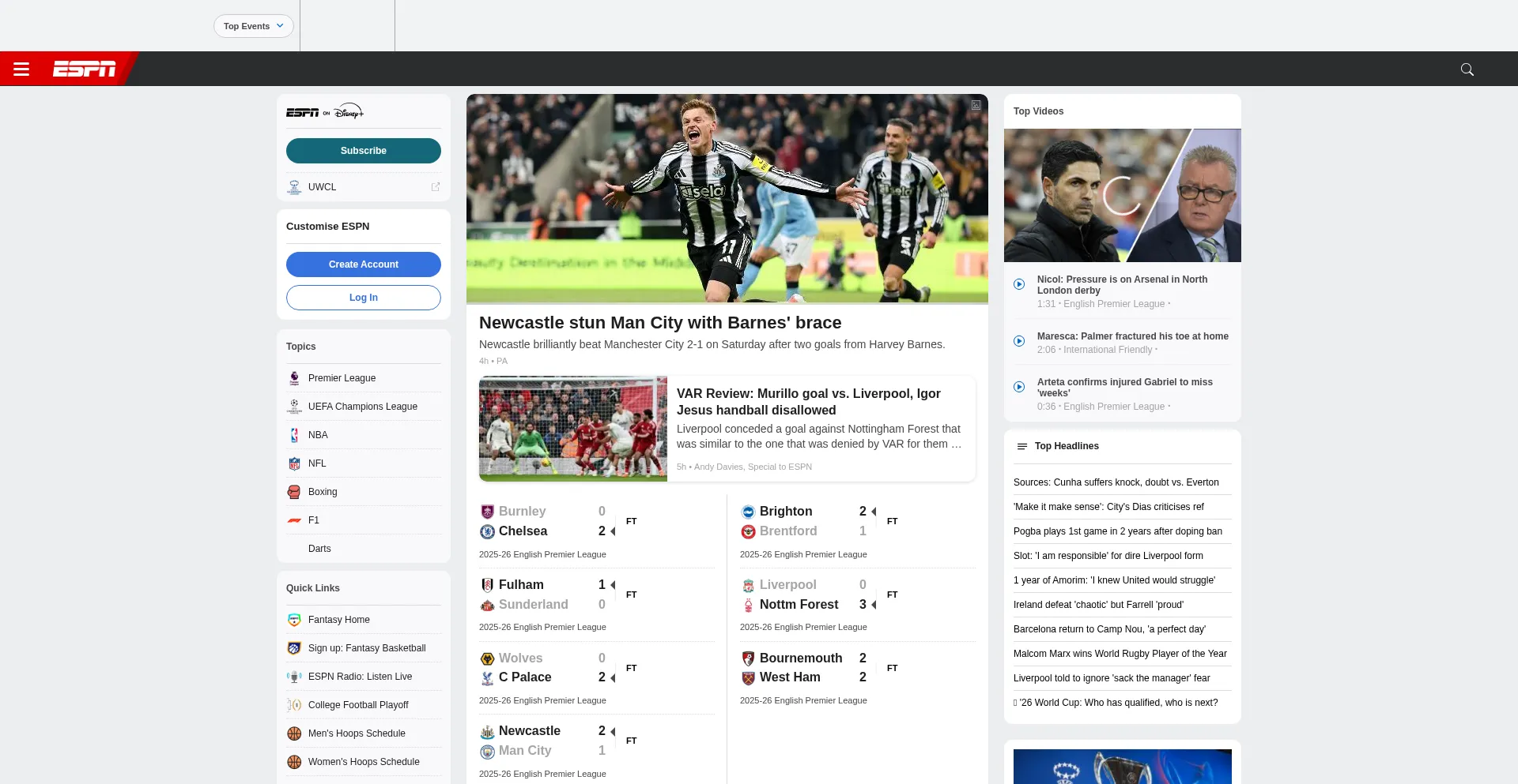 Visit ESPN to get up-to-the-minute sports news coverage, scores, highlights and commentary for Football, Cricket, Rugby, F1, Golf, Tennis, NFL, NBA and more.
