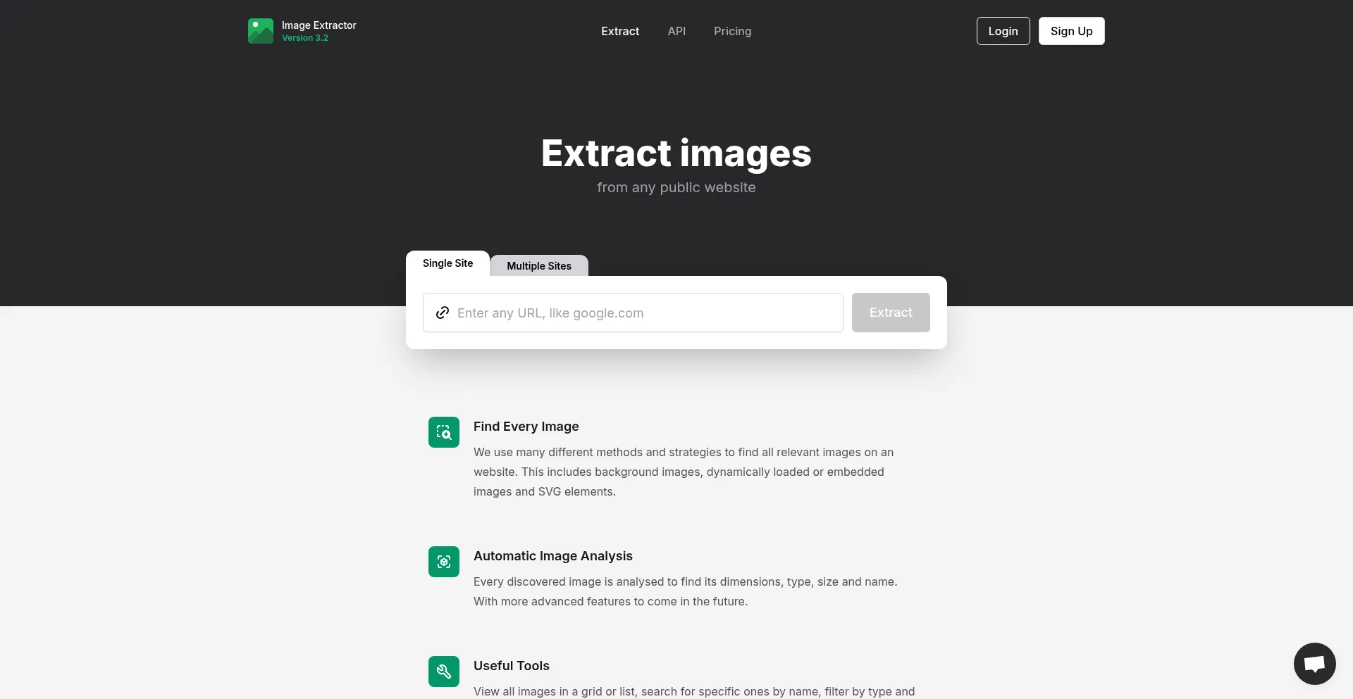 extract.pics is a free tool to extract, view and download images from any public website by using a virtual browser. Now with an easy-to-use API.