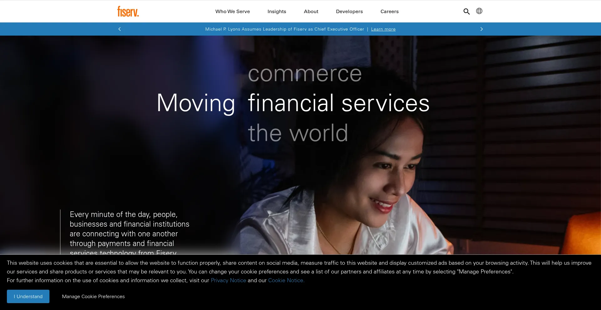 Fiserv is a global fintech and payments company with solutions for banking, global commerce, merchant acquiring, billing and payments, and point-of-sale.