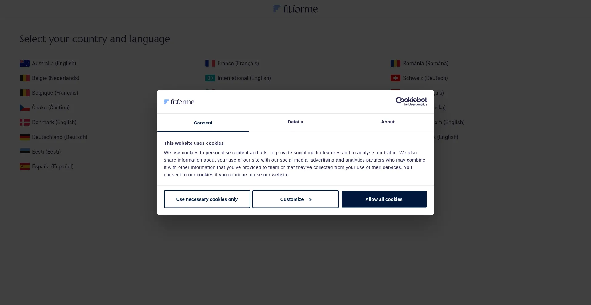 Welcome to FitForMe. Select your country and language.