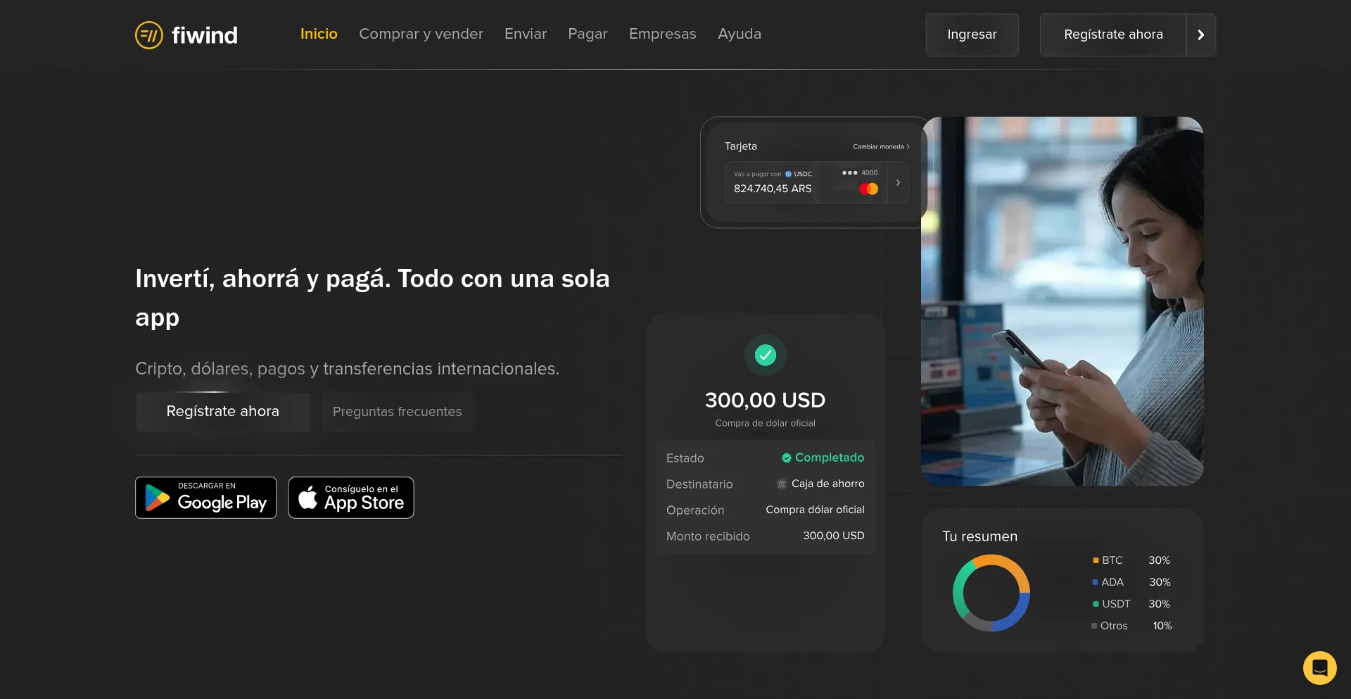 Gestioná tus finanzas con facilidad en Fiwind. Comprá y vendé criptomonedas, abrí tu cuenta en dólares, enviá dinero al exterior y pagá servicios y mucho más
